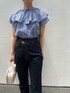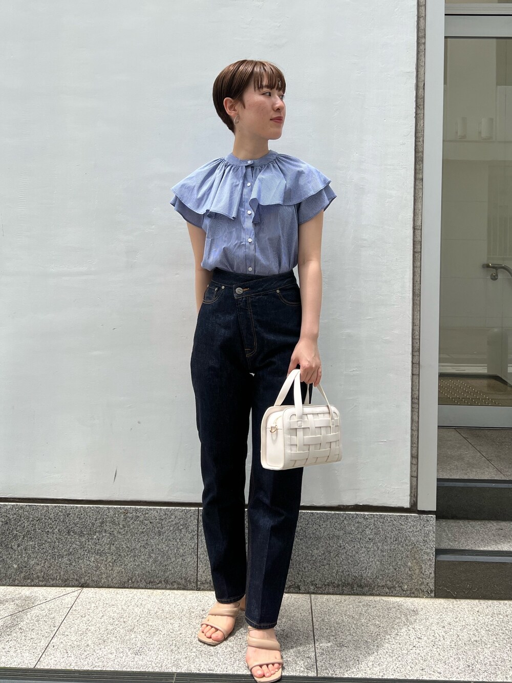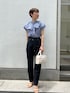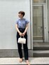 トレンドmix♡カジュアルコーデ! 【ブラウス】 襟の取り外しによって2way着用可能。 ブルー×ホワイトの細かいストライプ柄が夏らしく爽やか。綺麗めのブラウスを気軽に着たかったのでデニムを合わせてカジュアルにコーディネートしてみました。袖口の広がったデザインなので、二の腕を目立たせずほっそり見せてくれますよ! 【パンツ】 ヒップ・太ももまわりを綺麗にカバーして足をスッと綺麗に見せてくれるテーパードシルエット。 柔らかいデニムなので肌馴染み良く動きやすいです♡ 163センチでMサイズ着用してちょうどすっきり着れる丈感。 丈直ししても綺麗なシルエットで着れるので、小柄さんにもおすすめ。 【バッグ】 ミニボストン型なので荷物もしっかり入る♡ ショルダー付きなので肩掛けもできますよ♩ 【サンダル】 普段24.0〜24.5センチサイズでMサイズ着用。 足の甲を綺麗にホールドしてくれるので安定感もあり歩きやすいです! 【ピアス】 華奢な揺れるデザインがお洒落です♡