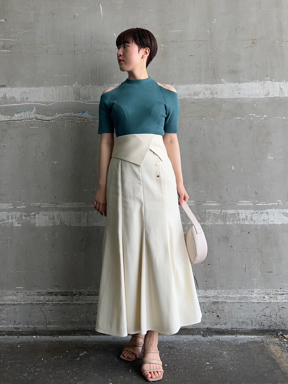 大人の肌見せ♡クールな印象のカラーニットコーデ♩ 【オープンショルダーニットプルオーバー】 夏らしい気分の上がるターコイズグリーン。 ホワイトのマーメイドスカートと合わせて、綺麗めカジュアルにコーディネート。 接触冷感素材なので着心地さらっとして快適。 ハイネックだけど肩の部分が横に広く開いているので顔まわりスッキリと着こなせますよ! 【スカート】 春ごろ大好評だったスカートに新色登場! ウエストラペルのデザインがしっかりとウエストマークしてくれるので細見え効果抜群。 華奢でウエストサイズがぶかぶかが多い🥲という方にもずり落ちること無く履ける!と好評でした♡ 柔らかく、肌馴染みの良い生地なので真夏に着ても暑苦しくなく過ごせそうです♡ 163センチでMサイズ着用しており足首がしっかり見える丈感。Sサイズは−4センチ短くなるので小柄さんにもおすすめ。 【シューズ】 綺麗めコーデもカジュアルコーデもお洒落に決まります❤︎ 柔らかい素材感なので、ストラップ部分が肌に食い込むことなく足の痛さは全く感じません! 足の甲をしっかりホールドしてくれるので普段ヒールをあまり履かない方にもおすすめ。 【バッグ】 JWPEIからセレクトされたバッグ。シンプルなデザインなのでテイスト選ばずコーデに取り入れやすいです♡ 【アクセサリー】 揺れる華奢なデザインが可愛いですよ♩