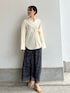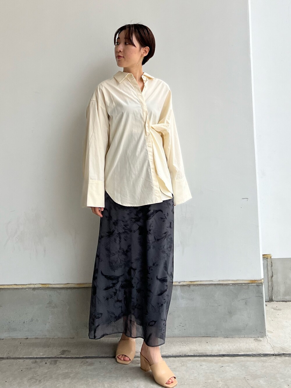 大人カジュアルなシャツコーデ 【トップス】 ボタンの留め方を変える事で、2通りの着こなしを楽しめるオーバーサイズシャツ。 広めのお袖のシルエットも凄くお洒落です♡ ハリ感のある素材ですが、クタっと着れる柔らかい生地なので9月から羽織として活躍しますよ🍂 【スカート】 大人っぽく着れるボタニカル柄はシンプルなトップスと合わせるだけで一気にお洒落見えします👌 ヒップ・太ももをカバーしてスッキリ着れるデザインなので骨格ウェーブさんにおすすめのシルエット。 Tシャツなどを合わせてカジュアルな着こなしも楽しめます♡ 163センチでMサイズ着用し足首が隠れる丈感なので高身長さんもロング丈楽しめますよ〜! 【サンダル】 クッションに包まれてるような履き心地♡ 足の甲までしっかりホールドしてくれるので歩きやすいですよ〜! シンプルなデザインなので、きれいめコーデやカジュアルなデニムコーデなど幅広く楽しめます! 【ピアス】 ドロップ型の揺れるチェーンがポイントになって可愛い♡