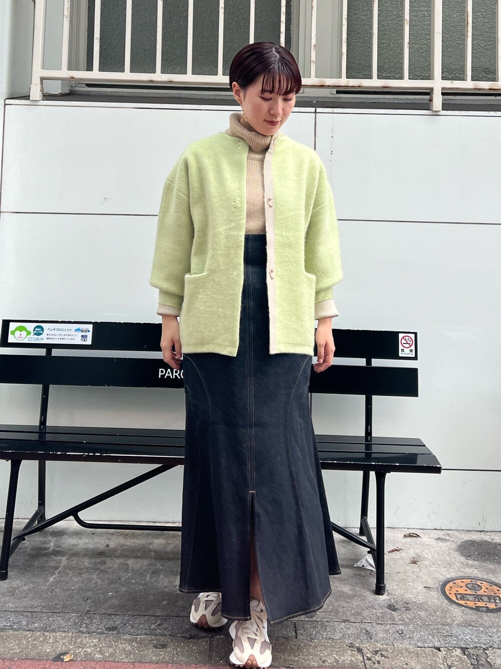 大人カジュアルなデニムコーデ 【アウター】 LAGUNAMOONの名品アウター♡ 保温性が高く、さっと軽く羽織れるカーディガンなので秋〜春まで重宝しますよ✨ 裏地がニット生地になっているので、肌に毛が当たってチクチクする事も無し。シンプルに、上品なデザインはコーディネート迷わず取り入れられるので毎日使いにぴったりです! 【トップス】 ぽってりとしたボリュームスリーブのニットにビーズ刺繍がポイント! チクチク感のない柔らかい着心地です。 キレイめコーデにもカジュアルコーデにも合わせやすいデザインなのでオンオフ迷わず活躍しますよ〜!✨ 【スカート】 デイリー使いに一枚あると重宝するデニムスカート。 大人も着やすい、女性らしい印象のマーメイドシルエットなので子供っぽくならずコーディネートに取り入れやすいです♡ ヒップラインは広めの作りなので骨格ウェーブ体型の私の体型カバーにぴったり◎ ウエスト部分はベルトで調整可能なので華奢な方にもおすすめです。 163センチでMサイズ着用しており、くるぶしに少しかかる丈感。小柄さんやスニーカーを履く方におすすめですよ♡ 【ピアス】 揺れ感のあるドロップチェーンがポイント! コーデがランクアップして見えます✨