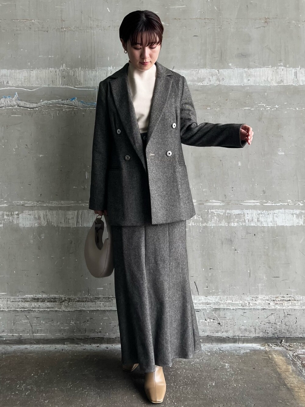 トレンドのツイード素材♡冬のセットアップコーデ 【ジャケット】 リサイクルウール生地を使ったツイードジャケット。 軽い着心地なので肩凝ることなくさらっと羽織りやすいですよ♡ 肩が少し落ちたデザインなので、肩幅しっかりある私もゆったりと羽織ることができました! ボリュームスリーブのニットの上から羽織っても袖には余裕があるので、秋の軽羽織として活躍しそうです◎ 【トップス】 肩のエンブロイダリーデザインがポイントになる秋冬トップス♡ ブラックにほんのりパープルを混ぜたような色味です。 程よい透け感なので肌の露出感気にせず着て頂けます。 袖とウエスト部分がリブになっているのでテクニック要らずで可愛いシルエットでの着こなしができました! もっちりした生地のニット素材なので着心地も良く、秋冬スタメンになりそうです! 【スカート】 ウール生地の冬っぽい質感がニットとの相性抜群。 日本の尾州という産地で作られた生地を使用している所にも拘りを感じ、愛着の湧く一枚。 ハイウエストのすっきりしたシルエットのマーメイドスカートなので、スタイルアップ効果に感動! 背中部分がゴム使用なのでニットをインしても窮屈感なく履く事が出来ました! 163センチでSサイズ着用しておりくるぶしが綺麗に見える丈感。 150〜155センチの小柄さんだと、Sサイズでしっかり長め丈で着て頂けるので3〜5センチヒールのショートブーツ等を合わせるとよりバランスよく着て頂けますよ! 【バッグ】 ころんっとしたサイズ感が可愛らしい! コンパクトに荷物をまとめたい日におすすめ。 【ピアス】 さりげない存在感でコーディネートに合わせやすい!毎日使いに丁度良いです。