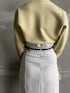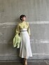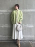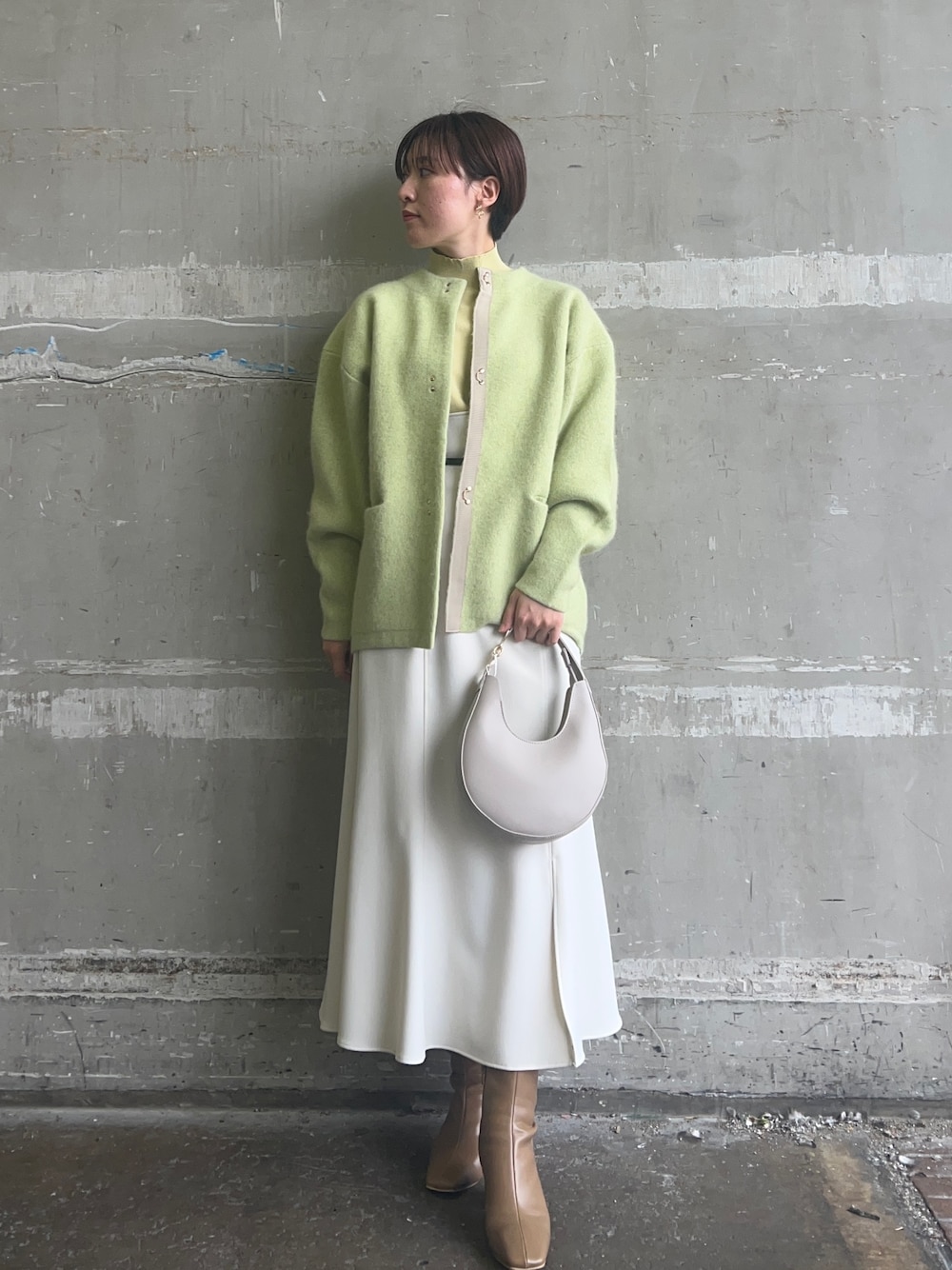柔らかい、女性らしさあるグリーンコーデ 【カーディガン】 今年3年目のベストセラーアイテム!ふわっとしたのラクーン(たぬき)の産毛の部分を使用した優しい着心地のカーディガン。 ふわっと柔らかいライトグリーンなので派手見えせずにコーデの差し色にぴったり。 裏地はニット生地になっているのでチクチク感もなく保温性バッチリで冬もかなり暖かく過ごせます♡実際に2色持っているのですが、ヒートテック+ニットに羽織るだけで電車通勤の私はコート要らずで身軽に冬を越せました! しっかり防寒したい方はインナーダウンを仕込むと良いですよ◎ 【トップス】 肩のエンブロイダリーデザインがポイントになる秋冬トップス♡ ライムグリーンをほんのり薄くしたような、顔映りがパッと映えるカラー♡ 程よい透け感なので肌の露出感気にせず着て頂けます。 袖とウエスト部分がリブになっているのでテクニック要らずで可愛いシルエットでの着こなしができました! もっちりした生地のニット素材なので着心地も良く、秋冬のスタメンになりそうです! 【スカート】 ウエスト部分のカットデザインがポイントのマーメイドスカート。 締め色になるベルトとセットなので、キュッとウエストマークが出来てスタイルアップ効果抜群でした♡ ややゆとりのあるサイズ感なので、ヒップ・太ももあたりもピタッとしすぎない楽な着心地もおすすめポイント。 フロント部分にはさりげなくスリットも入っているのでロング丈でも足捌き良く歩きやすかったです◎ 163センチでMサイズ着用し足首が見える丈感なので長すぎずにスッキリと着こなせますよ♡ 【ブーツ】 ふかふかの履き心地に感動。 普段24.0〜24.5サイズでMサイズを選んでいます!靴下を履いていても若干余裕があるので窮屈感なく足が痛くならず嬉しい♡ 【バッグ】 ころっとしたフォルム感がコーデのポイントになります♡ 携帯、ハンカチ、三つ折り財布など荷物を最小限にお出かけしたい日にぴったり。
