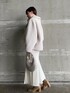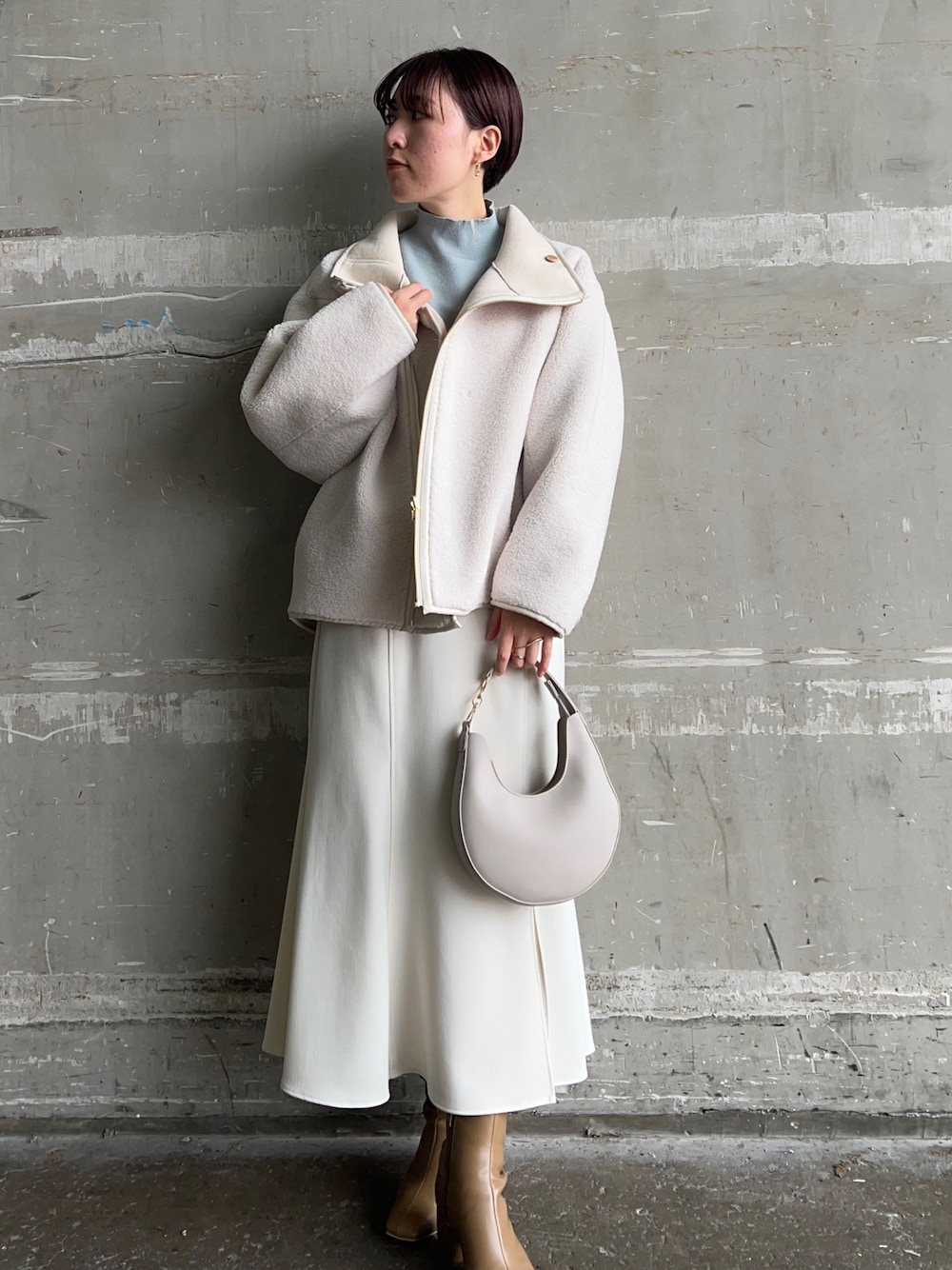 大人フェミニンなホワイトコーデ 【トップス】 肩のエンブロイダリーデザインがポイントになる秋冬トップス♡ ライムグリーンをほんのり薄くしたような、顔映りがパッと映えるカラー♡ 程よい透け感なので肌の露出感気にせず着て頂けます。 袖とウエスト部分がリブになっているのでテクニック要らずで可愛いシルエットでの着こなしができました! もっちりした生地のニット素材なので着心地も良く、秋冬のスタメンになりそうです! 【アウター】 リバーシブルデザインでコーデを2倍楽しめる冬のカジュアルアウター✨ オーバーサイズでゆったり着こなせるので、カジュアルスタイリングにおすすめ。 袖はたっぷりと余裕があるので、ボリュームスリーブのトップスを合わせてもサッと羽織れました♡ ファスナーをしっかり上げると首がすっぽりと埋もれる着こなしも可愛いポイントです♡ 【スカート】 ウエスト部分のカットデザインがポイントのマーメイドスカート。 締め色になるベルトとセットなので、キュッとウエストマークが出来てスタイルアップ効果抜群でした♡ ややゆとりのあるサイズ感なので、ヒップ・太ももあたりもピタッとしすぎない楽な着心地もおすすめポイント。 フロント部分にはさりげなくスリットも入っているのでロング丈でも足捌き良く歩きやすかったです◎ 163センチでMサイズ着用し足首が見える丈感なので長すぎずにスッキリと着こなせますよ♡ 【ブーツ】 ふかふかの履き心地に感動。 普段24.0〜24.5サイズでMサイズを選んでいます!靴下を履いていても若干余裕があるので窮屈感なく足が痛くならず嬉しい♡ 【バッグ】 ころっとしたフォルム感がコーデのポイントになります♡ 携帯、ハンカチ、三つ折り財布など荷物を最小限にお出かけしたい日にぴったり。