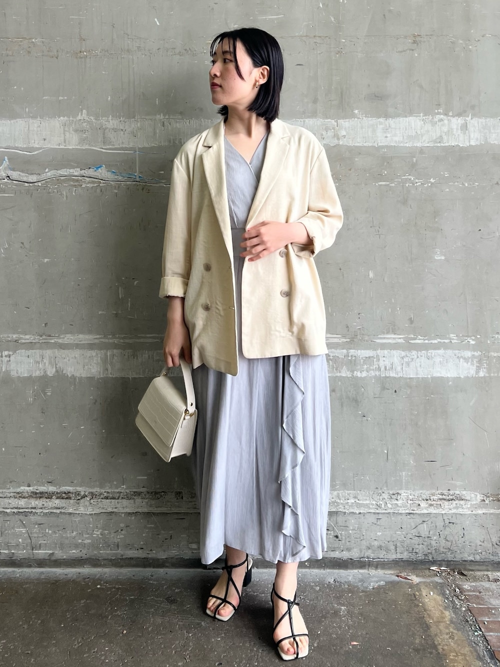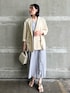 品良く着こなすワンピース×ジャケット 【ジャケット】 冷房対策でも使える◎春〜秋ジャケット。 薄手素材なのでカーディガン感覚で羽織やすい♡ ゆったり着れるサイズ感なので、気張りすぎずデイリー使いしやすいです◎ お袖は長めなので、好みの長さに曲げて調節するのがおすすめ。(個人的には2.3回曲げがお勧め◎) 【ワンピース】 楊柳素材が涼しげな印象のワンピース。 スカート部分のラッフルデザインがポイント。 開きすぎないVネックなので、胸元が寂しく見えない♡ ウエストマークのあるデザインですが、背中部分は伸縮性のあるゴム使用なので窮屈感無く着ることが出来ますよ! 163センチでMサイズ着用しており足首上4〜5センチとかなりすっきり着れる丈感です♩ 【バッグ】 JWPEIからセレクトアイテム。 コンパクトなサイズ感が可愛らしい♡ ショルダー付きです♩ 【サンダル】 足首をしっかりホールドしてくれるストラップデザインなので安定感良く履きやすいです♡