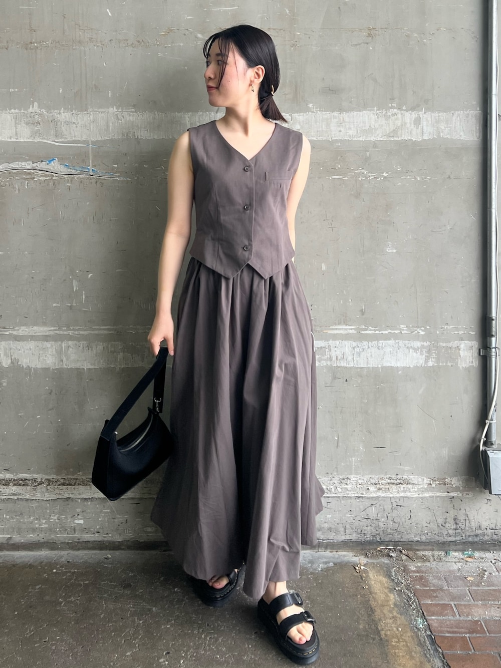 モダンカジュアルなワンピースコーデ 【ワンピース】 セットアップのようなデザインがお洒落さをUPして見せてくれるワンピース。 カジュアルな印象のワンピースなので、休日のお出かけにぴったりです◎ 実は、スカート部分にはウエストゴムが入っているので楽な着心地。 インナーにコンパクトなサイズ感のTシャツをINした着こなしもオススメです。 【サンダル】 Dr.martinからセレクトアイテム。 ベーシックなデザインなのでどんなコーデとも相性抜群です◎