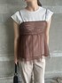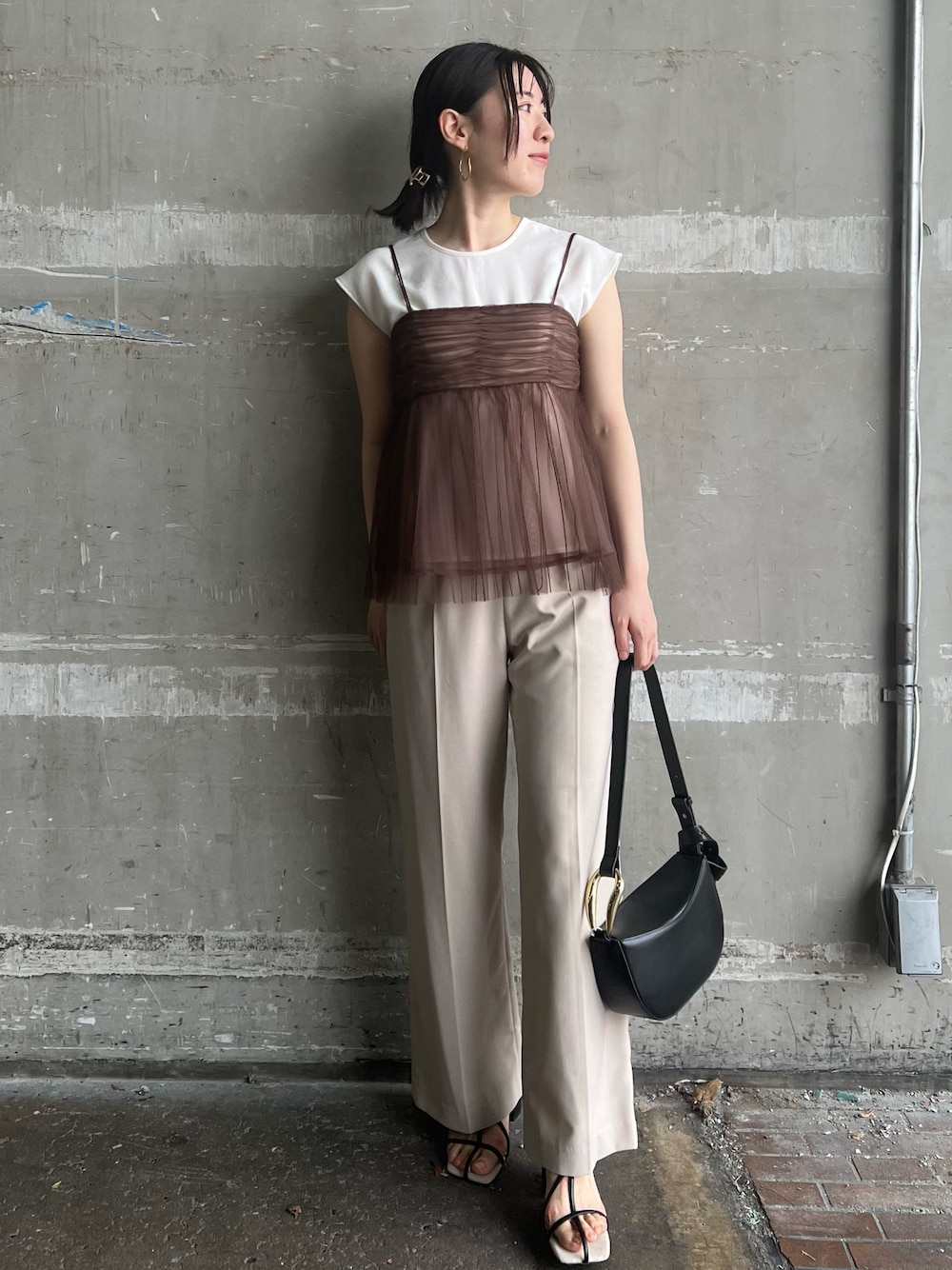 トレンドのチュールアイテム♡大人カジュアルコーデ 【トップス】 今年トレンドのチュールキャミ♡ トップスとドッキングになったデザインなのでシンプルなボトムスと合わせるだけでお洒落にコーデが決まります♩インナー部分はブラウスのような生地になっており、さらっとした着心地◎ カジュアルになりすぎず、大人女子にも着やすいトレンドアイテムです✨ 【パンツ】 さらっと肌離れの良い夏生地を使用したストレートパンツ。 ワイドすぎず、センタープレスの入ったデザインなので下半身のシルエットをスッキリ綺麗に見せてくれます✨ ハイウエストデザインなので、インもアウトもバランスよく着こなせて万能。 163センチでMサイズ着用し、くるぶしにしっかりかかる長めの丈感。 丈詰めしてもパンツシルエット変わらずに着て頂けるので、丈が長く感じる場合はお好みの長さにお直しに出すのもおすすめです♩ 【サンダル】 足元が華奢に見えるストラップサンダル♡ しっかり足首までホールドしてくれるので、パカパカ感なく歩きやすいです◎