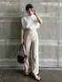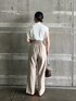 上品に着こなす大人パンツスタイル 【トップス】 肩までしっかり隠れる袖丈なので二の腕ほっそり見えが叶います♡ 接触冷感のニット生地なので気温や湿気の高い日でもストレス無くさらっと着れて優秀◎ ウエストリブになっているので、インせずくびれがキュッと見えますよ♡ 【パンツ】 ウエストデザインがポイントになり、くびれをキュッと綺麗に見せてくれます◎ ヒップ・太もも周りのラインをスッキリと見せてくれるのでスタイリッシュな着こなしがお好みの方におすすめ。 163センチでMサイズ着用しておりくるぶしにかかる長めの丈感。 丈詰めしてもシルエット変わらず綺麗に着ていただけるので、お好みの長さへのお直しもおすすめです☺︎ 【バッグ】 ゴールドのチェーンがアクセントに♡ 斜めがけから肩掛けまで調整できるので使い勝手の良さが魅力♡ 【サンダル】 お洒落に見えるフラットサンダルは夏に重宝する事間違いなし✨ 足首まで固定してくれるストラップが付いているのでパカパカ感なく履きやすいですよ♡