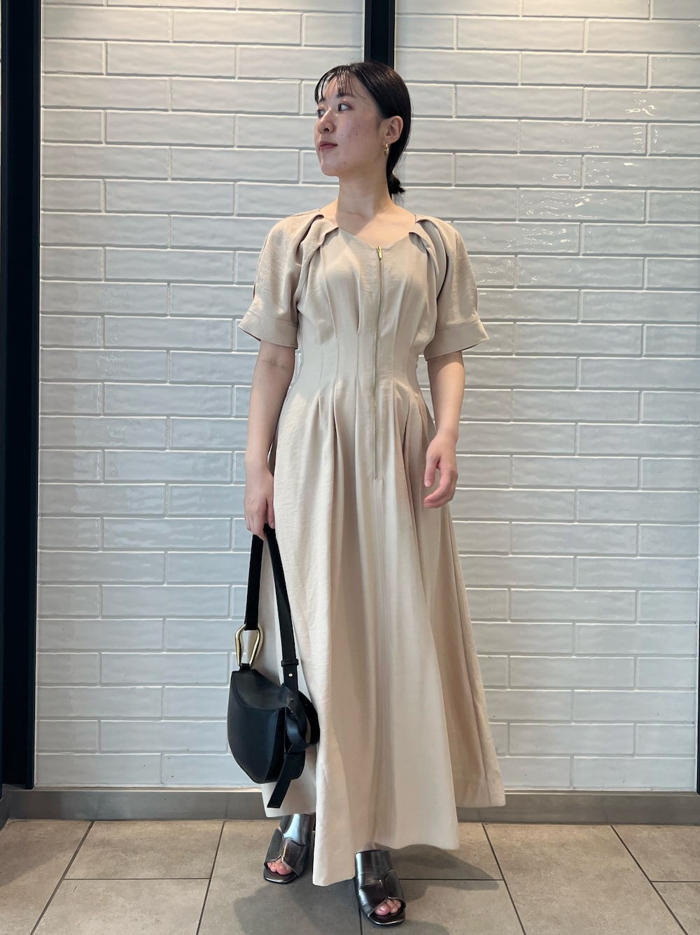1枚でお洒落に!スタイルアップ効果抜群のワンピース 【ワンピース】 ピタッとウエストマークのあるデザインなのでスタイルアップ効果抜群のワンピース♡ お袖のボリューム感とデコルテの空き具合のバランスが良く、店頭でご試着されたお客様は必ず着痩せ効果に驚かれます♡ 軽く、触ると柔らかさのある生地なのでストレスのない着心地もおすすめポイント。 フロントZIPがカジュアルさも出してくれるので、スニーカーやスポーティーなサンダルとのコーデもおすすめです。 163センチでMサイズ着用しておりくるぶしに綺麗にかかる丈感。 150〜155センチの方はSサイズでヒール3センチ以上のシューズで合わせると丈感良く着て頂けますよ♡