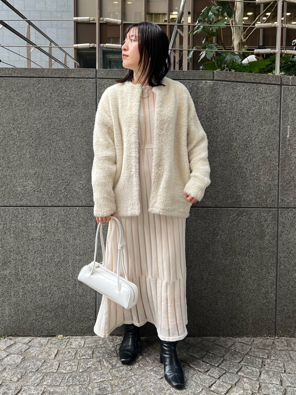 【ワンピース】 ふわふわの着心地に感動するワンピース✨ お腹・ヒップ周りのシルエットは拾わず、付属のベルトでウエストマークができるので細く見せたい部分はキュッと締めてメリハリあるシルエット。 163センチでMサイズ着用しておりくるぶしにかかる丈感。スニーカーを合わせたカジュアルなスタイルもお勧めです! 【カーディガン】 ふわふわの触り心地に感動。ずっと触っていたくなる肌触りです!上品なモカカラーは落ち着いた大人な印象。 とにかく軽い織り心地が魅力を重たいコートが苦手な方や車や電車など乗り物に乗る方にもストレス無く着て頂けます! 毛玉になりづらく、毛が抜けづらい点もおすすめ。 【ブーツ】 スクエアトゥデザインで足元まですっきり見えるデザイン。 ヒールの横幅がしっかりあるので、安定感のある履き心地です。