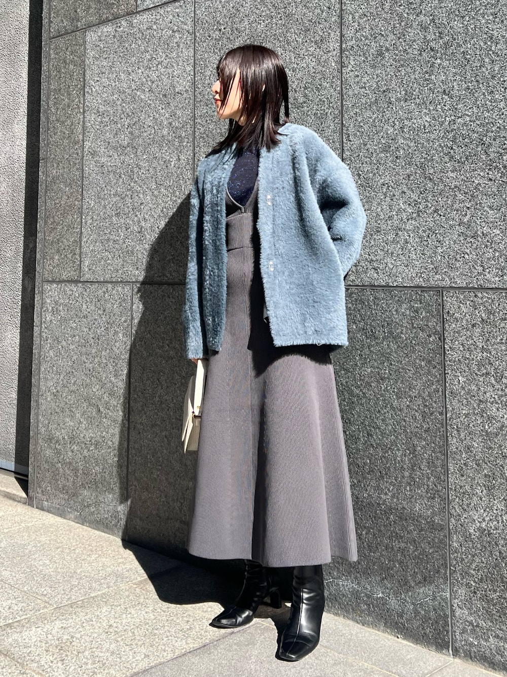 【カーディガン】 軽さ、洗練されたシンプルなデザインがおすすめ。チャコールグレーは少し青みが強く、コーデのポイントになるカラー。 ヒップがしっかり隠れる丈感なので暖かく、ウールコートを織る前の中間アウターとして活躍しますよ! 【ワンピース】 ウエストマーク×綺麗なAラインシルエットなので女性らしさのある上品な印象。 チャコールグレーの落ち着いた色味は重たすぎず、柔らかな印象なので大人っぽく着たい方におすすめ。 163センチでMサイズ着用しており、ウエスト周りは薄手のニットでもぴったり。くるぶし上のスッキリとした丈感なので150〜155センチの小柄さんにも長さ気にせず着て頂けそうです! 【トップス】 ネイビー×青ラメがこれからのホリデーシーズンムードにぴったり。 実は袖口部分はシアー素材との2重になっており、細かい部分までお洒落を楽しめます♡
