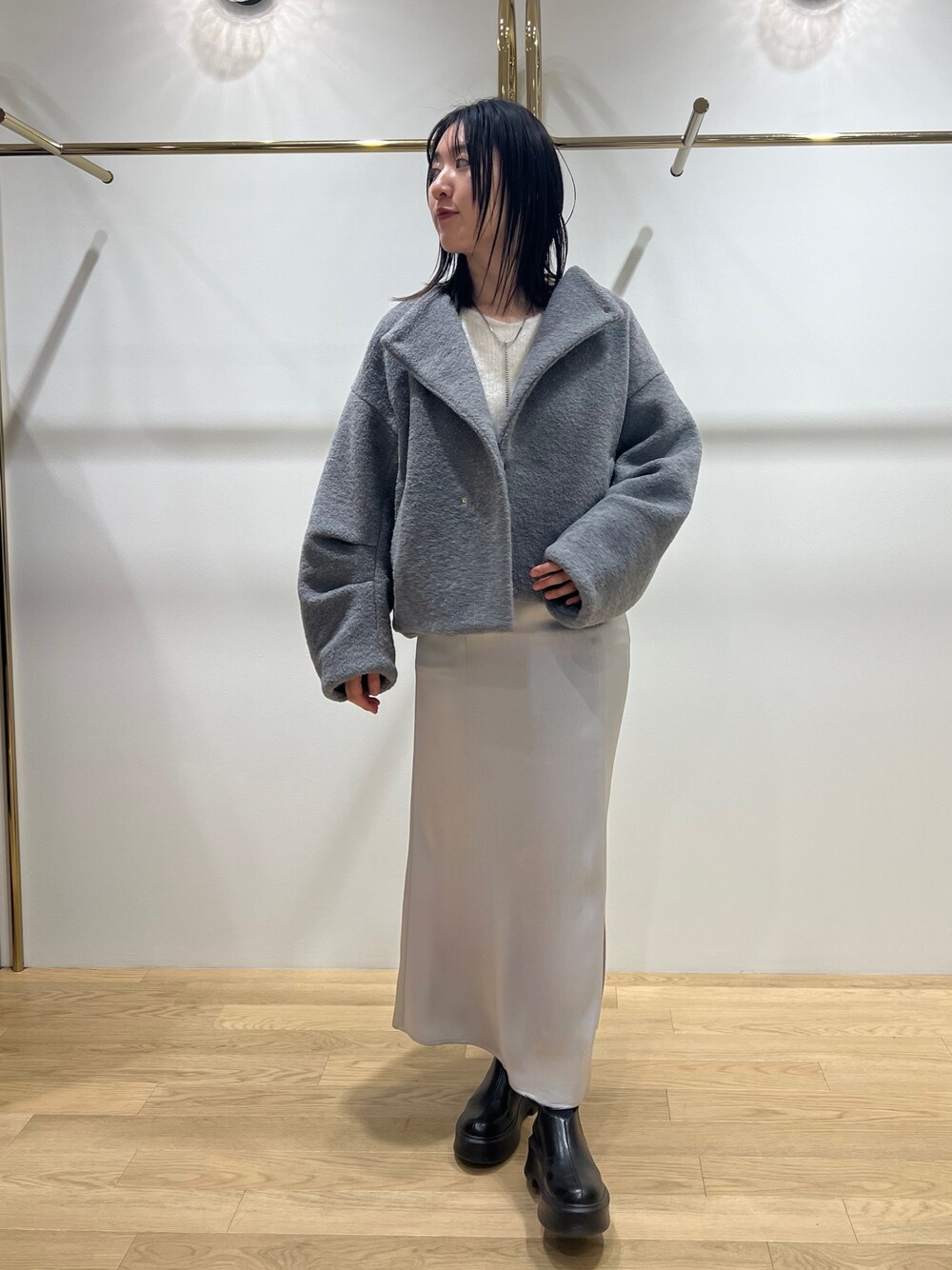 【アウター】 程よい短丈のブルゾンなので高身長さん、低身長さんともにバランスよく着こなして頂いてます♩ 袖にゆとりがあるので、厚めのニットの上からもさらっと羽織ることができる所もポイント。 軽量なので肩こりの心配要らずです◎ 【トップス】 アルパカの糸を使用しているのでとにかく軽く、暖かい! 首元がスッキリしているのでボリュームスリーブデザインですが着膨れせず着こなして頂いてますよ♡ 【スカート】 マットな質感のサテンスカート。 実物はぽこぼことしたやや立体感のある素材なのでカジュアルコーデにも取り入れやすい! ウエストはゴム使用なのでとにかく楽な履き心地。腰回り(特にヒップライン)はスッキリと、下にかけてやや広がるシルエットなので下半身カバー力に長けたデザインです! 163センチでMサイズ着用しており麗にくるぶしにかかる丈感。 150~155センチの方にもSサイズで着ていただくと長すぎず、スニーカーで合わせてもバランスよく着て頂けます!