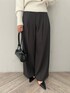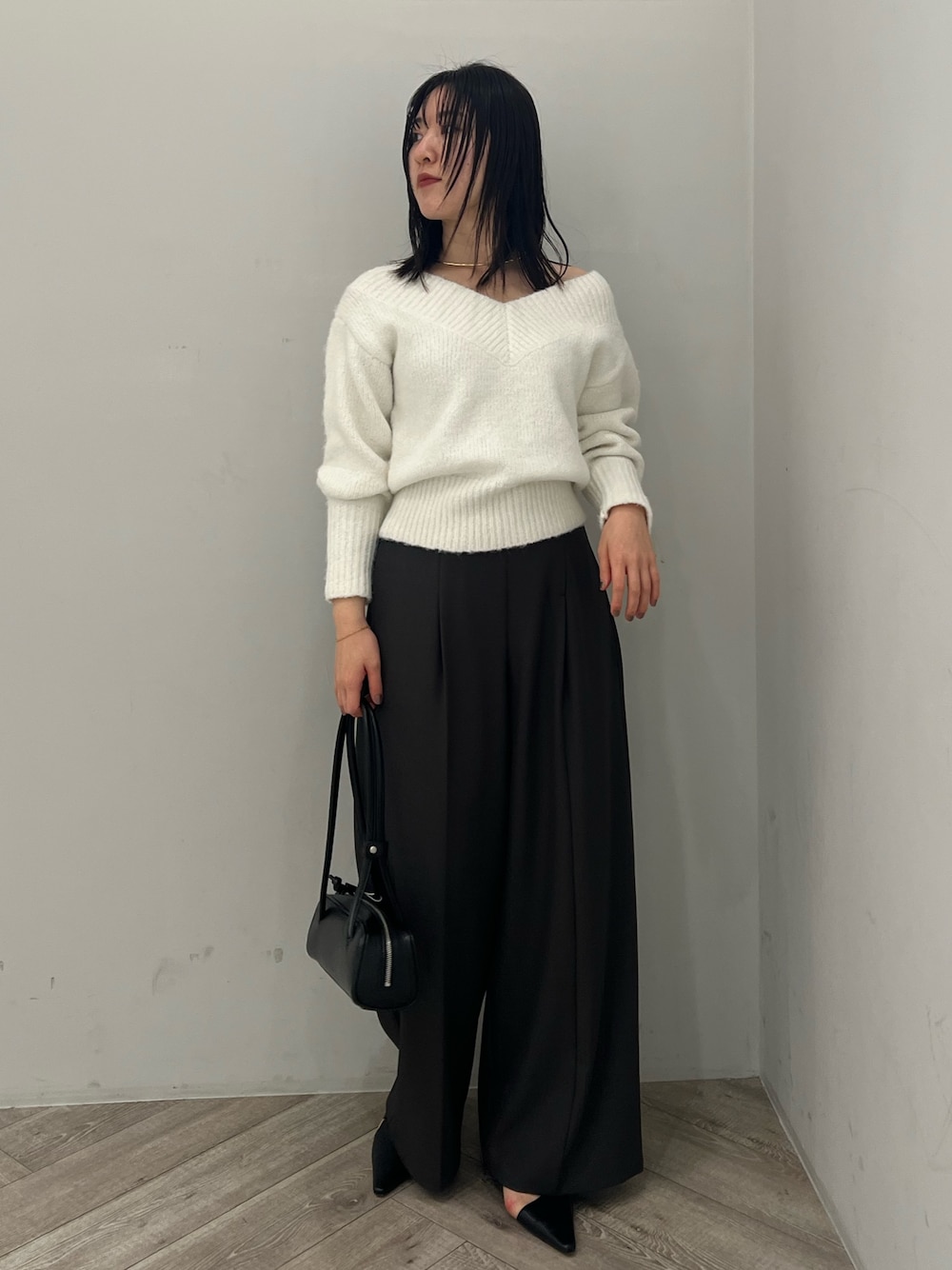 【トップス】 大きく開くVネックデザインなのでデコルテ周りを綺麗に見せてくれます。 ウエストでキュッと締まるリブになっているのでインせずくびれをしっかり見せてくれて優秀 ! 厚地のニットなのでインナーの透け感などはあまり気になりませんでしたが、念のため白・ベージュ・グレーなど透けづらいインナーを合わせることをおすすめします! 【パンツ】 とにかく美シルエットが叶うワイドパンツ。 位置の高いハイウエストデザイン+バイカラーの細ベルトSETなので、視覚的に細見え効果をUPさせてくれますよ! 個人的には、骨格ウェーブ体型の悩みであるヒップ位置の低さを麗にカバーしてくれる所に感動。 163センチでMサイズ着用しており、くるぶしに丁度かかる丈です。いつもより短めにサイズ設定されているので、個人差ありますが店頭では152~155センチの小柄さんにもSサイズをお直し要らずで着用頂いています◎