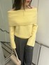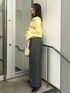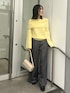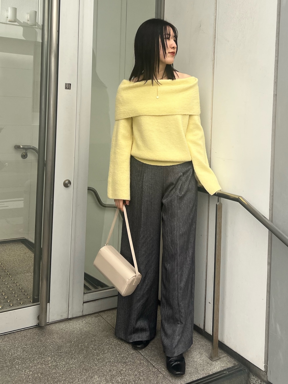 【トップス】 肩が落ちすぎないデザインなので肌見せが得意じゃない方にも手に取りやすいデザインのオフショルニットです。 ブラトップに変えず、下着の肩紐も少し外側にずらして着用しています! 裾部分がリブになっているので、ボトムスにINもアウトスタイリングもバランスよく見せてくれますよ、 やや荒目のニットなので、肌が敏感な方は首元が広く開いたTシャツを合わせると◎ 明るいレモンイエローは春先にもおすすめ。 パンツ】 とにかく美シルエットが叶うワイドパンツ。 位置の高いハイウエストデザイン+バイカラーの細ベルト SETなので、視覚的に細見え効果をUPさせてくれますよ! 個人的には、骨格ウェーブ体型の悩みであるヒップ位置の低さを麗にカバーしてくれる所に感動。 163センチでMサイズ着用しており、足首がしっかりかかる長めの丈感。 6センチヒールのブーツ着用で底に付かず着ることが出来ました○ パンツ丈の長さが欲しい高身長さんにおすすめ。