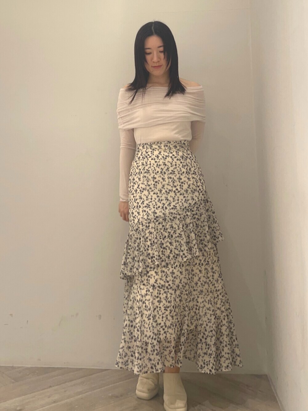 【トップス】 今季気になるオフショルトップス♡ やや透け感のあるとろみある柔らかい生地なので、伸縮性があり着心地の良さに感動します。 インナーにはベージュのブラトップ着用しており、肌の透け感はあまり気になりませんでした◎ 【スカート】 フェミニンな印象で着れるフリルティアードデザイン♡甘見えする小花柄ではないので、20代後半に突入した私でも抵抗なく着ることができました◎ ヒップまわりはすっきりと、裾にかけて広がるデザインなので骨格ウェーブ体型の私の腰回りもすっきり見せてくれて感動。同じ体型悩みがある方に是非お試し頂きたいです♡ 163センチでMサイズ着用しています♩ 【シューズ】 24.0センチでMサイズ着用。 安定感のある太いヒールなので長時間履いていても疲れづらく、ショッピングなど沢山歩く日にもおすすめ。