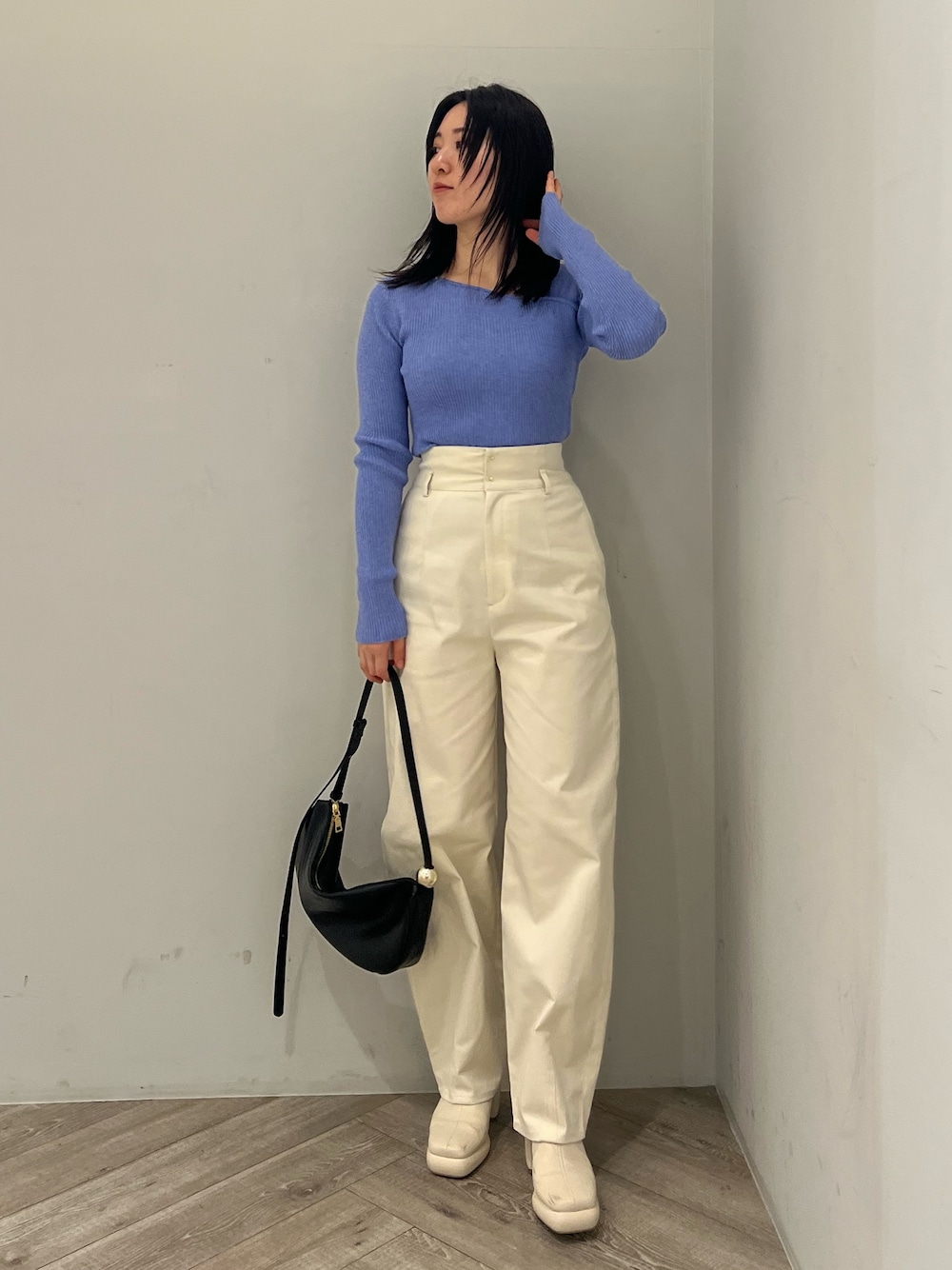 【トップス】 首元がアシンメトリーになっているので肌見せは控えめに、デコルテラインをスッキリ見せてくれます。 肌を綺麗に見せてくれるブルーです◎ 【パンツ】 足を真っ直ぐ、長く見せてくれるシルエットに感動!✨ やや伸縮性のある綿混生地なので履き心地もいいですよ♡ 163センチでMサイズ着用。ヒールを履いてくるぶしが綺麗に隠れる丈感とやや長めなので〜164センチくらいの方でしたら1サイズ下げて頂くと長さ気にせず着用できそうです◎ 【シューズ】 24.0センチでMサイズ着用。 太めのヒールでかなり安定感のある履き心地なので長時間歩くショッピングなどにもおすすめ♡ 【バッグ】 500mlペットボトルがすっぽり入る大容量サイズ! ショルダー紐の長さ調整ができるので斜め掛けも可能です◎