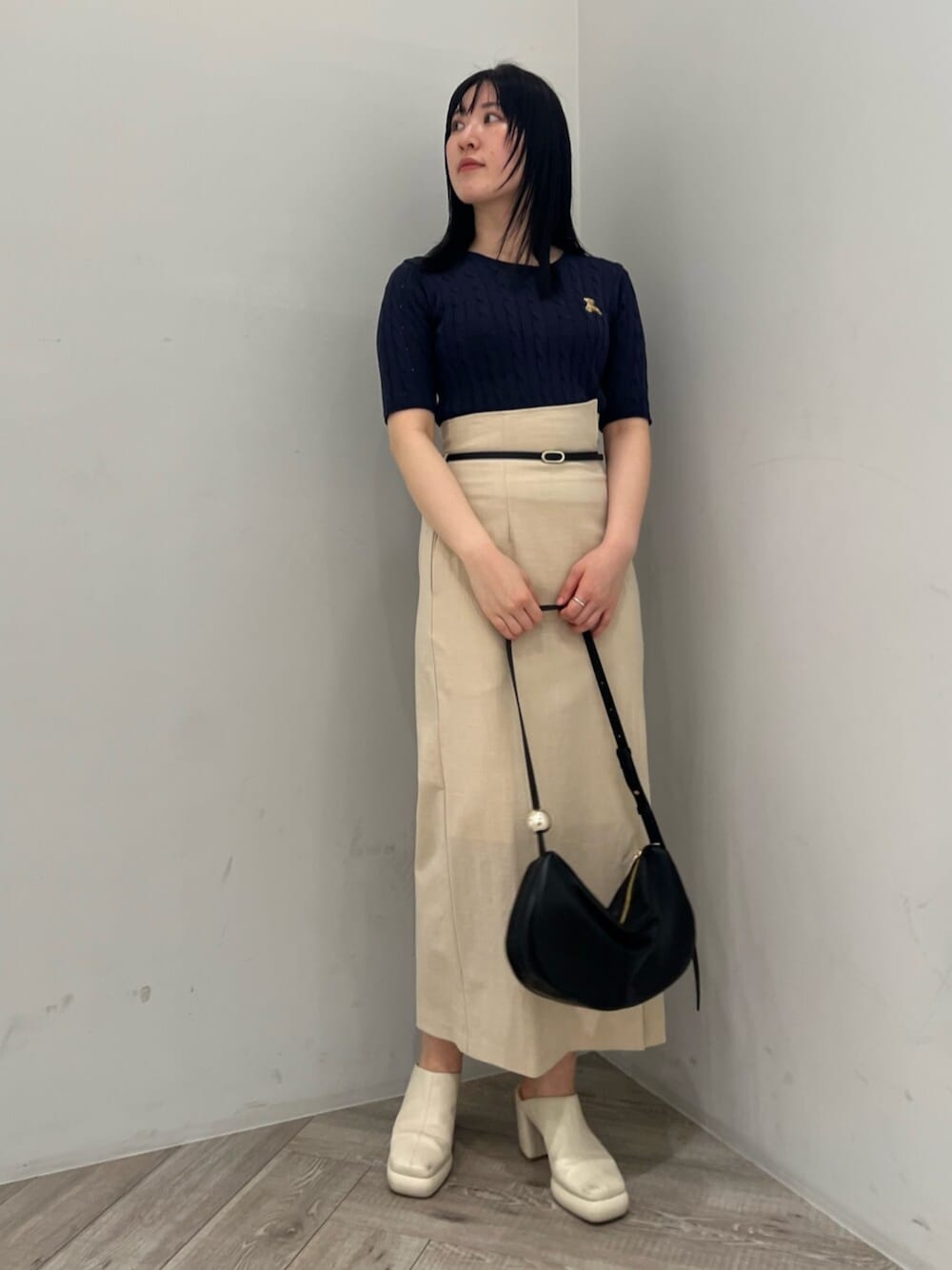【スカート】 シンプルなタイトシルエット。 伸縮性のある素材なので窮屈さのない履き心地。左側に浅めのスリットが入っています● 163センチでMサイズ着用。 足首がすっきりとみえる短めの丈感なので小柄さんにもおすすめ。 【トップス】 POLOBCSコラボレーションアイテム第二弾 ケーブル編みの薄手のニット✕ベアのワンポイントが可愛い。 ベーシックで上品な印象のデザインなので、通勤コーデとしても活躍しそうです! ハイウエストのパンツやスカート、デニムなどボトムスはテイスト選ばず合わせやすいですよ! 【シューズ】 ぽってりとしたヒールデザインがポイント。 スクエアトゥデザインなので、ロングのパンツやスカートとのコーディネートも足元までスッキリと見せてくれます◎ 実際に店頭で勤務中約7.5時間着用していますが、ヒールが軽いので歩きやすく重宝しています! 【バッグ】 500mlのペットボトルがすっぽりと入る大容量サイズ。