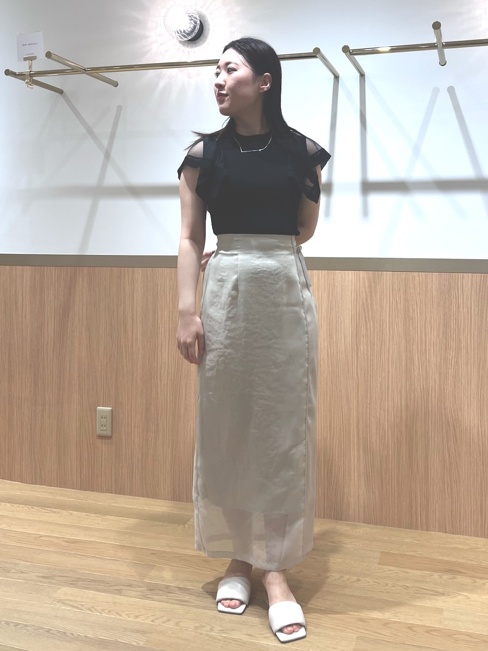 【トップス】 お袖のシアー感がポイント。 程よく二の腕をカバーしてくれるデザインなので腕を出すのが得意で無い方にも着て頂きやすいですよ! 細かい縦リブの入ったニット生地なので、スッキリとした着こなしが好みの方へおすすめ。 【スカート】 ヒップ・太もも周りを綺麗にカバーしてくれる|ラインシルエット。ウエストもゴム仕様&ベルトで調整可能なので体型選ばず麗にご着用頂けます! 163センチでMサイズ着用。 しっかり長さがありますが、足は透け感があるので重たさなくスッキリした印象ですが 【シューズ】 24.0センチでMサイズ着用。 生地が柔らかいので足が痛くなりずらいですよ♥
