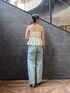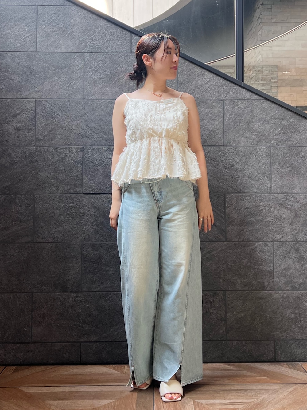 【トップス】 一枚で着映えする夏トップス✨ 胸下に切り替えが入るので、しっかりスタイルアップして見せてくれますよ! 【デニムパンツ】 ヒップがキュッと上がって見える、美脚効果抜群のシルエット。 フロント部分のスリットの効果で足元をスッキリと見せてくれます! 163センチでMサイズ着用。 柔らかい生地なので履き心地の良さもおすすめポイント。 【サンダル】 24.0センチでM着用。 安定感のあるヒールなので履き心地も良くおすすめです。