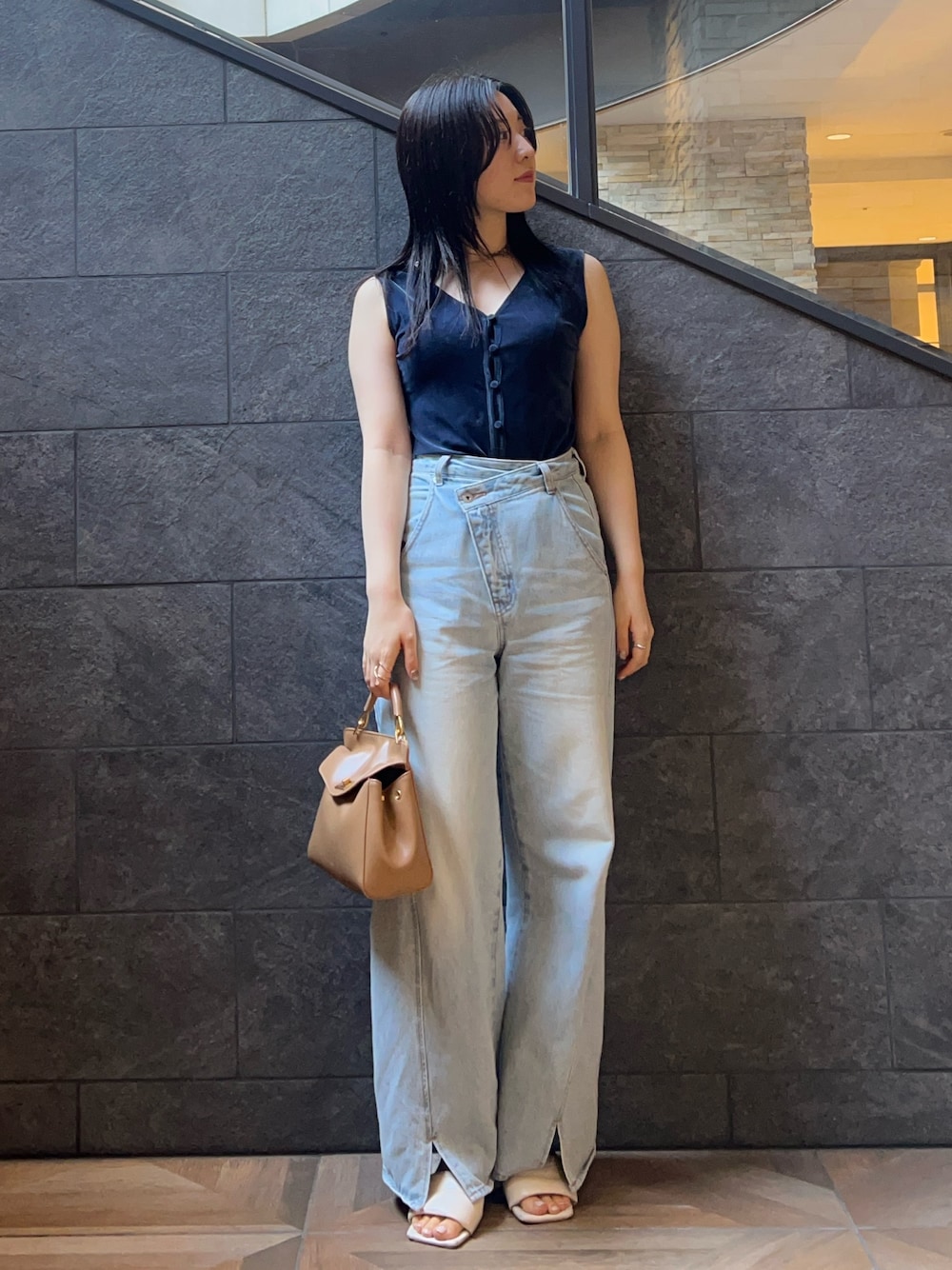 【トップス】 夏でも着れるベロア素材✨ 裏地がメッシュになっているので通気性良く、夏でも快適に着て頂けます◯ 【デニム】 163センチでMサイズ着用。 ヒップアップしてくれるデザインなので履くだけで美脚効果抜群です。 【バッグ】 しっかりとマチのあるデザインなので長財布まではいります◯ 【シューズ】 24.0センチでM着用。 太めのヒールなので安定感のある履き心地。