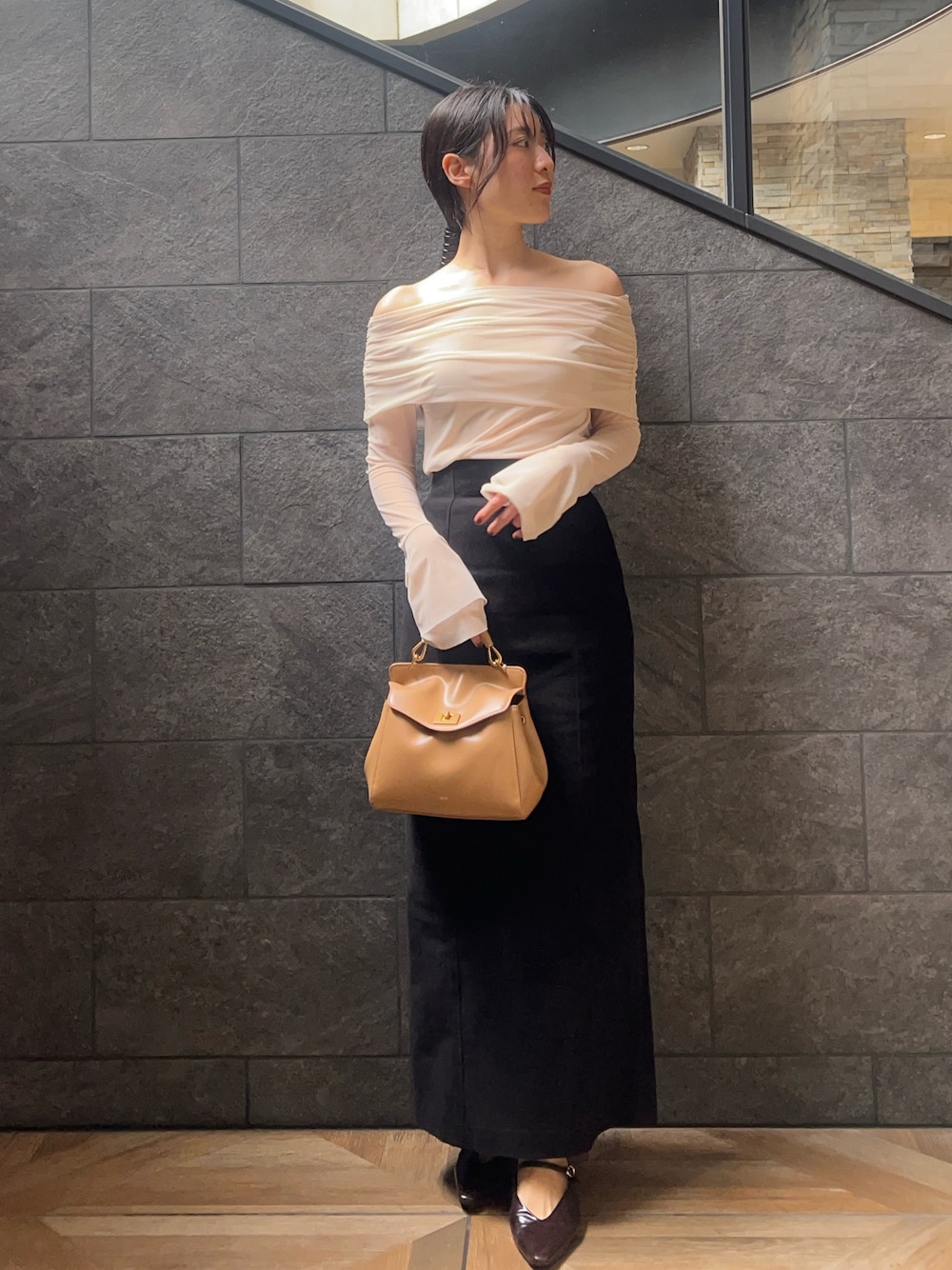 【トップス】 デコルテラインを綺麗に見せてくれるオフショルトップス✨ ほんのり透け感のあるチュール素材なので、肌の透明感が上がって見え女性らしい印象に見せてくれます。 インナーは白・ベージュのブラトップがおすすめです。 【スカート】 シンプルな|ラインシルエット。 ハイウエストデザインなので脚長効果抜群。骨格ウェーブ体型ですが、腰張り気にせず綺麗に着ることができました〇 163センチでMサイズ着用しくるぶし丈とかなり長めの丈感です。 【シューズ】 24.0センチでMサイズ着用
