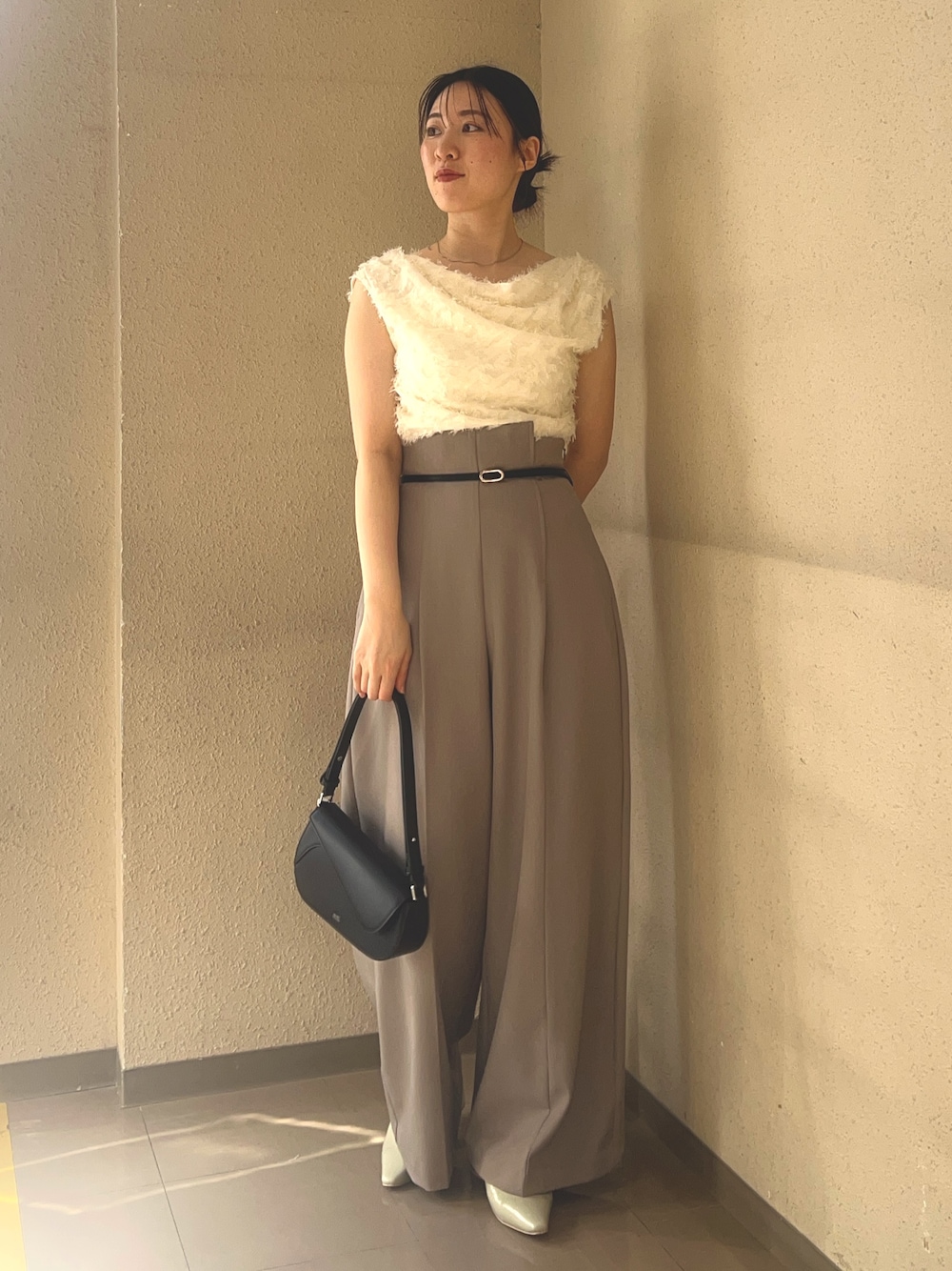 【トップス】 毛足のあるシャギー感がおしゃれなトップス。 二の腕を目立たせないシルエットなのでノースリーブが苦手な方にもおすすめ! 【パンツ】 163センチでM着用。 スタイルアップ効果抜群のハイウエストデザインです✨ シンプルなデザインなのでオンオフ問わず着回し力抜群です!