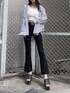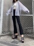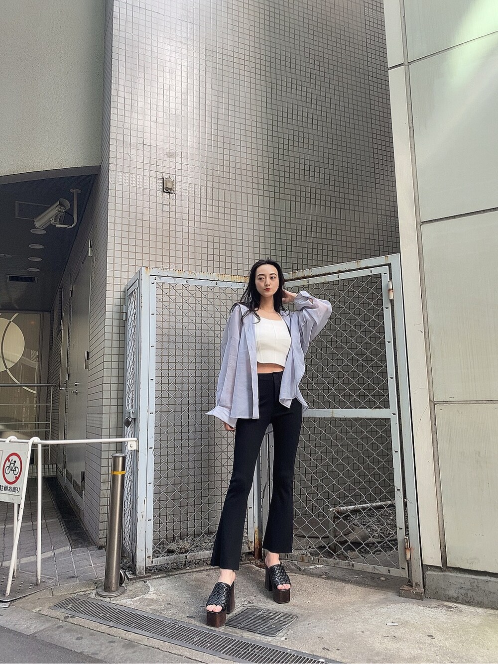 これからの季節にもってこいのシアーシャツ!!お尻がすっぽり隠れる丈感で気になる部分をカバーしてくれます◎私はモノトーンコーデにプラスで合わせてみましたが、薄めのデニム等で春夏らしい明るいコーデでもすごくかわいいです!そしてこのフレアパンツは、生地が柔らかくて楽ちんの履き心地ですし、スタイル効果抜群です!厚底サンダルと合わせて頂くと、より脚長効果があり綺麗に見えます。丈感が気になる方へもおすすめの合わせ方です♪