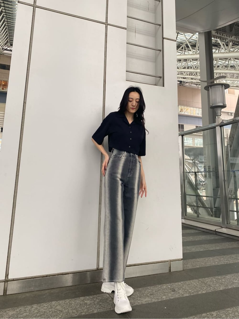珍しいストライプ柄が目に引くデニム!! ワイドシルエットで楽に履けて、ストライプ柄が足のラインを綺麗に足を長く魅せてくれます! 私はこのデニムをメインにしたかったので、トップスもスニーカーもモノトーンでシンプルにしてみました!いつもシンプルなデニムが多い方は特に一本持ってても着回しができて重宝すること間違いなしです!!!