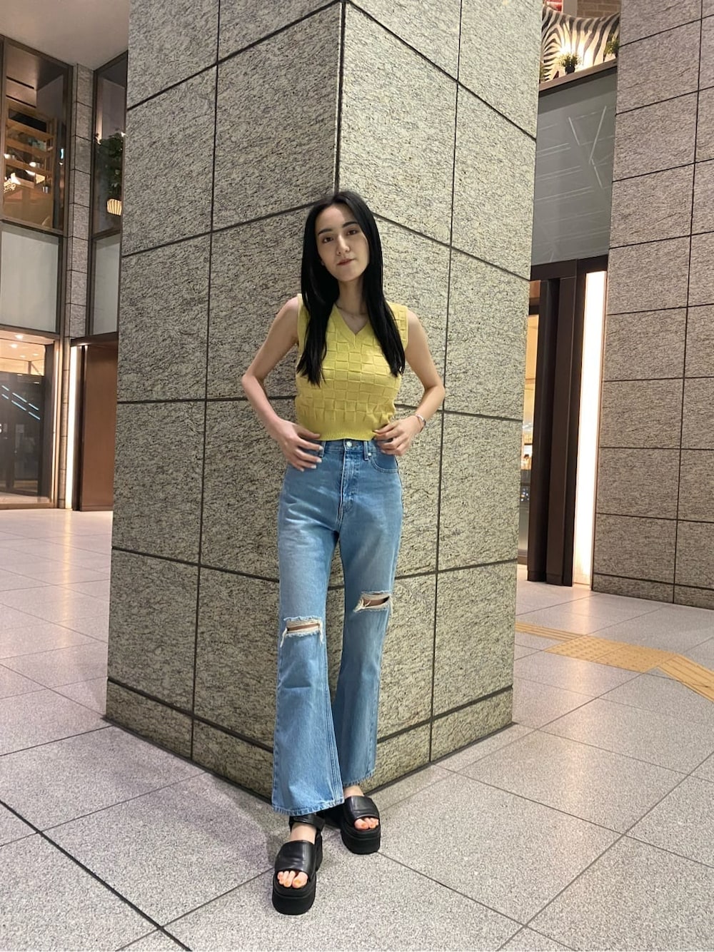 中村樹李亜(EMODA)のタンクトップ「チェッカーニットタンクトップ」を使ったコーディネート