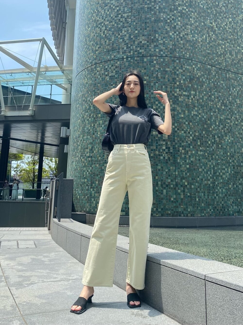 【大人カジュアルコーデ】【Tシャツ】左胸のロゴ刺繍がポイントの1枚!骨盤隠れる丈感なのでインでもアウトでもバランスの良い丈感なので使いやすいです!【デニム】一個ボタンなのにハイウエスト(おへそ隠れるぐらい)なので脚を長く見せてくれます!ワイドすぎない細めのストレートシルエットなので脚のラインを綺麗に魅せてくれます!デニムなのにサラッとした生地感なので季節問わずお使い頂けます!【サンダル】26センチ、Lサイズ着用で少しかかとが出るくらいです!クッションが効いているので履き心地が良くて、アッパー部分はニット生地なので靴擦れしにくくなっています!どんなコーデにも合わせやすいので夏一足持ってると万能です!