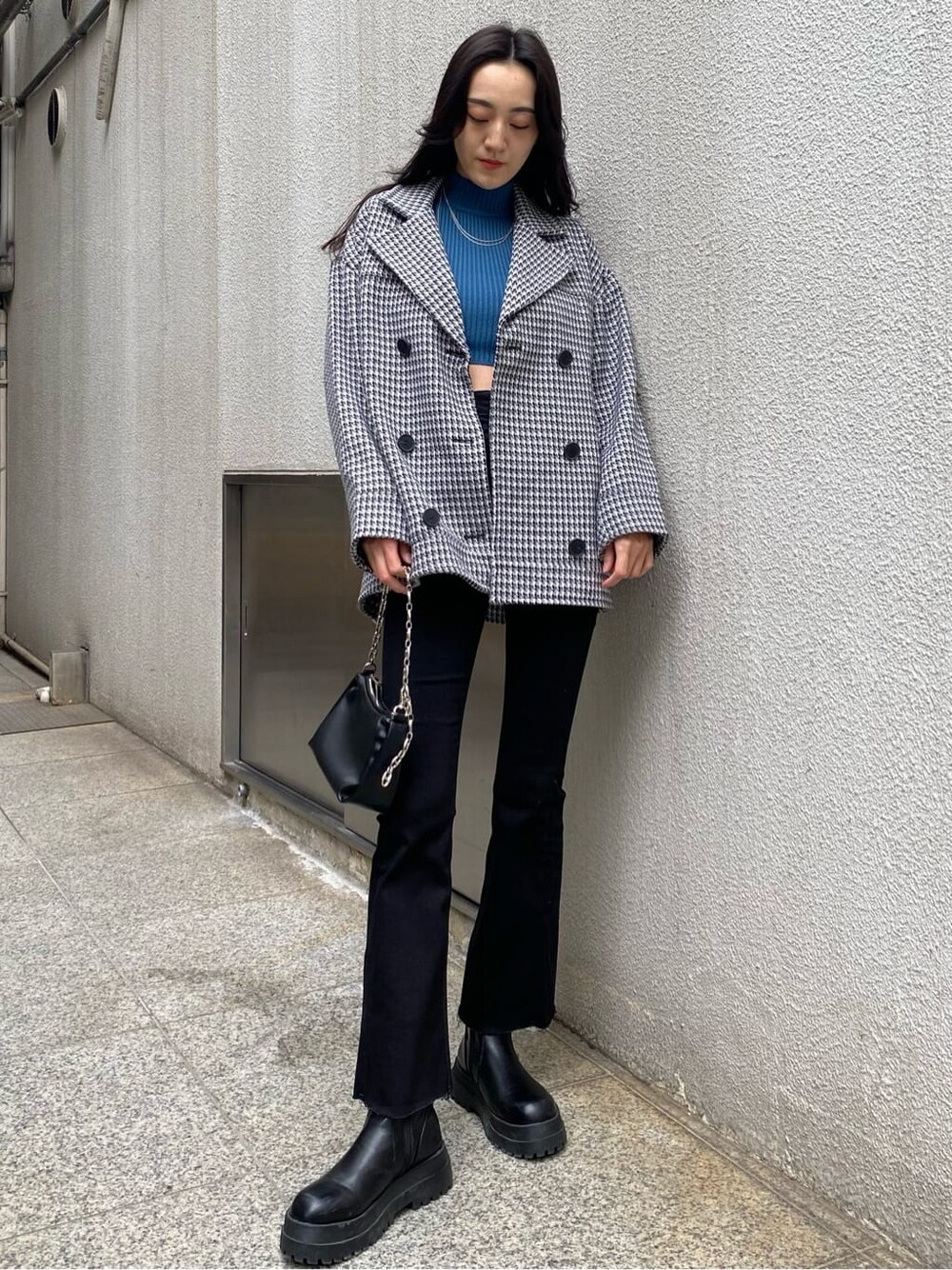 【秋の大人モードコーデ】【ニット】丈感はおへそより上のショート丈です!生地が厚手なので今の時期は1枚で着用できます!【ジャケット】お尻がすっぽり隠れる丈感なので、重く見えすぎないシルエットになります!袖周りが広いのでニットやトレーナーも着膨れせずに着れます!【デニム】175cm、Mサイズ着用でくるぶしかかるぐらいの丈感です!スキニーに近いシルエットが足のラインを綺麗に見せてくれます!【鞄】持ち手のチェーンで一気にこなれ感がでて、コーデのポイントになります!携帯、折りたたみ財布、鍵が入るくらいのコンパクトなサイズ感です!
