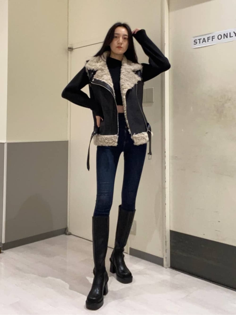 【秋のギャルコーデ】【ベスト】ライダース型のムートンベストで、秋から冬まで長く使って頂けます◎レザーの生地感は、柔らかく軽いので長時間着ても疲れないです! 丈感は、175cmでお尻半分隠れるくらいの丈感でした【ニット】肩下(脇あたり)部分にスリットが入っているのがポイントのニット!下着の紐は見えすぎずに着れるのが◎丈感はおへそぎりぎり隠れるくらいの少しショート丈です!【デニム】175cm、Mサイズ着用でハイウエストでおへそ隠れるくらいです!丈はくるぶしすっぽり隠れる丈感です!ストレッチが効いてるので柔らかく履き心地も◎ウエストが締まって見えて、足を長く見せてくれます!【ロングブーツ】サイドゴアなので脱ぎ着が楽で、細身で適度なフィット感があるので足長効果抜群のアイテムです!26cmの私がぎりぎり入るぐらいでした!ヒールは8cmなので高すぎず、傾斜が急すぎないので歩きやすかったです!【鞄】ファーのデザインが一気にコーデのポイントになります!携帯、折りたたみ財布、鍵が入るくらいのコンパクトなサイズ感です!