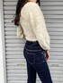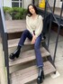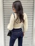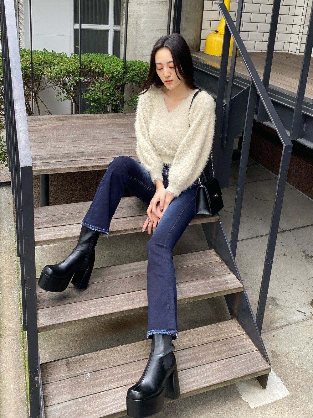 【冬の甘辛コーデ】【トップス】クロス部分を背面でも使える2WAYタイプ!かばっと胸元が開かない様ボタンがついています!ふわふわのシャギー生地で触り心地が良く一気に冬らしいコーデのポイントになります!【デニム】フレアデニムはストレッチが効いている為とても履き心地が良く、一般的なフレアデニムに比べると細身のシルエットでより美脚効果◎です!股上も長めのハイウエストでおへそ隠れるくらいあるのでショート丈との相性も◎です!【ブーツ】ヒールが11.5cmありますが、傾斜が緩やかなので安定して着用頂けます!サイドゴアなので程よく伸縮性があるので脱ぎ着もしやすく歩きやすいです!細身のシルエットなので足を長く見せてくれます!【バッグ】ハンド用チェーンと、ショルダー用のチェーンが付いている2WAYタイプ!まちが広めで、長財布が入るくらいの長さ感です!