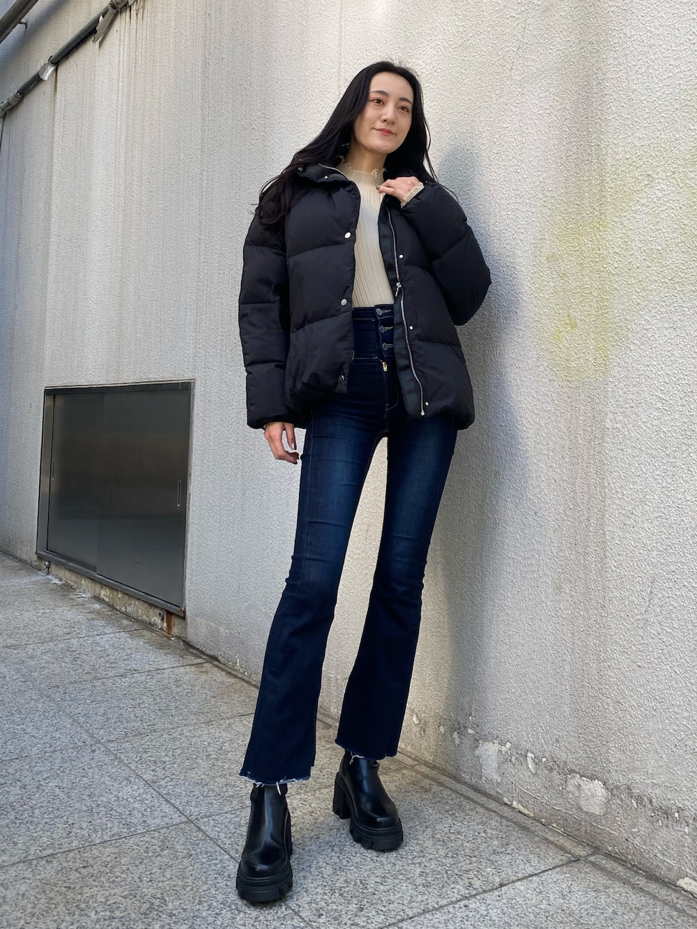 【きれいめカジュアルデニムコーデ】【デニム】スキニーよりの形のフレアデニムなので足が細長くみえるデザインです!股上が長くおへそ隠れるくらいあるのでショート丈のトップスとの相性◎です!履いた感じはストレッチがきいていて柔らかいデニム生地なので締め付け感なく履いて頂けます!【サイドゴアブーツ】26センチ、Lサイズ着用で足指当たってギリギリ履けるぐらいでした!ブーツなのにヒール8.3cm(Lサイズ)あるので少し傾斜ができて歩きやすく脚が綺麗にみえます!サイドゴアなので着脱もしやすく履き心地も良いです!【トップス】毎年人気のクラッシュニット!おへそぎりぎり隠れるくらい丈感で、ハイウエストのボトムスだとインして着れるタイトなシルエットのニットです!丈感長めなので折って着用するのも◎【ダウン】身長175cmでお尻半分隠れる丈感です!ダウンとフェザーが50%ずつ入っているので保温性が高く羽織った時とても軽いです!ファスナー付きのポケットがあって中はフリース素材なので手を入れるとポカポカになりました!