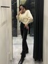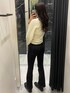 【きれいめカジュアルデニムコーデ】【デニム】スキニーよりの形のフレアデニムなので足が細長くみえるデザインです!股上が長くおへそ隠れるくらいあるのでショート丈のトップスとの相性◎です!履いた感じはストレッチがきいていて柔らかいデニム生地なので締め付け感なく履いて頂けます!【ニット】丈感は前がおへそ少し隠れる丈感で、後ろが前より長めのお尻かかるくらいです!クロスの幅が広めになっているので胸元空きすぎずに着れます!