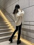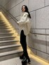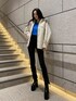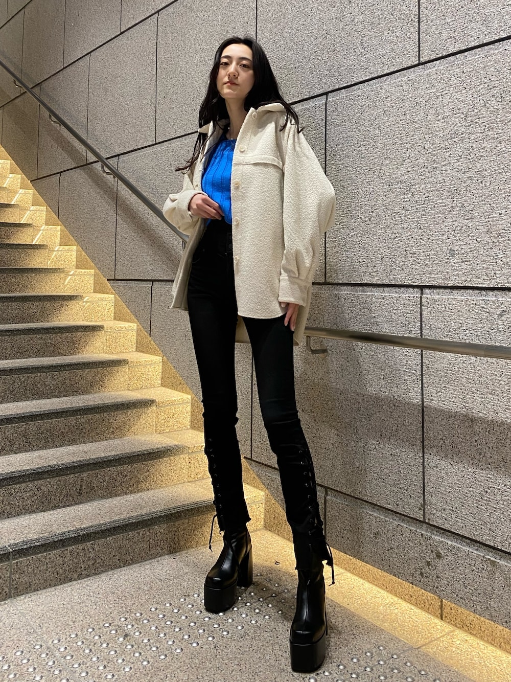 【モード好き必見春のお出かけコーデ】【ニット】おへそがぎりぎり隠れる丈感です!袖が長めなのでどの身長の方でもゆるっと感がでてラフな印象になります!【シャツ】EMODAで人気のオーバーシャツ!袖がゆったりした形なので中にトレーナーやニットを着込みやすい形です!後ろの丈感はお尻がすっぽり隠れるくらいです!ボタンを止めて上からベルトを巻くスタイルもおすすめです!【デニム】おへそより上の股上の長いハイウエストなので、腰の位置が高く見えて足が長く見えます!裾のレースアップがお好きな開きに調節が可能なので、足首の肌見せも楽しんでいただけます!身長175cm、Sサイズ着用でくるぶしかかるぐらいです!【シューズ】足首周りスキニーインできるほどのゆとりがあって、ヒールは高めですがヒール部分が太く、傾斜が緩やかなのでかなり安定して履いて頂けます!
