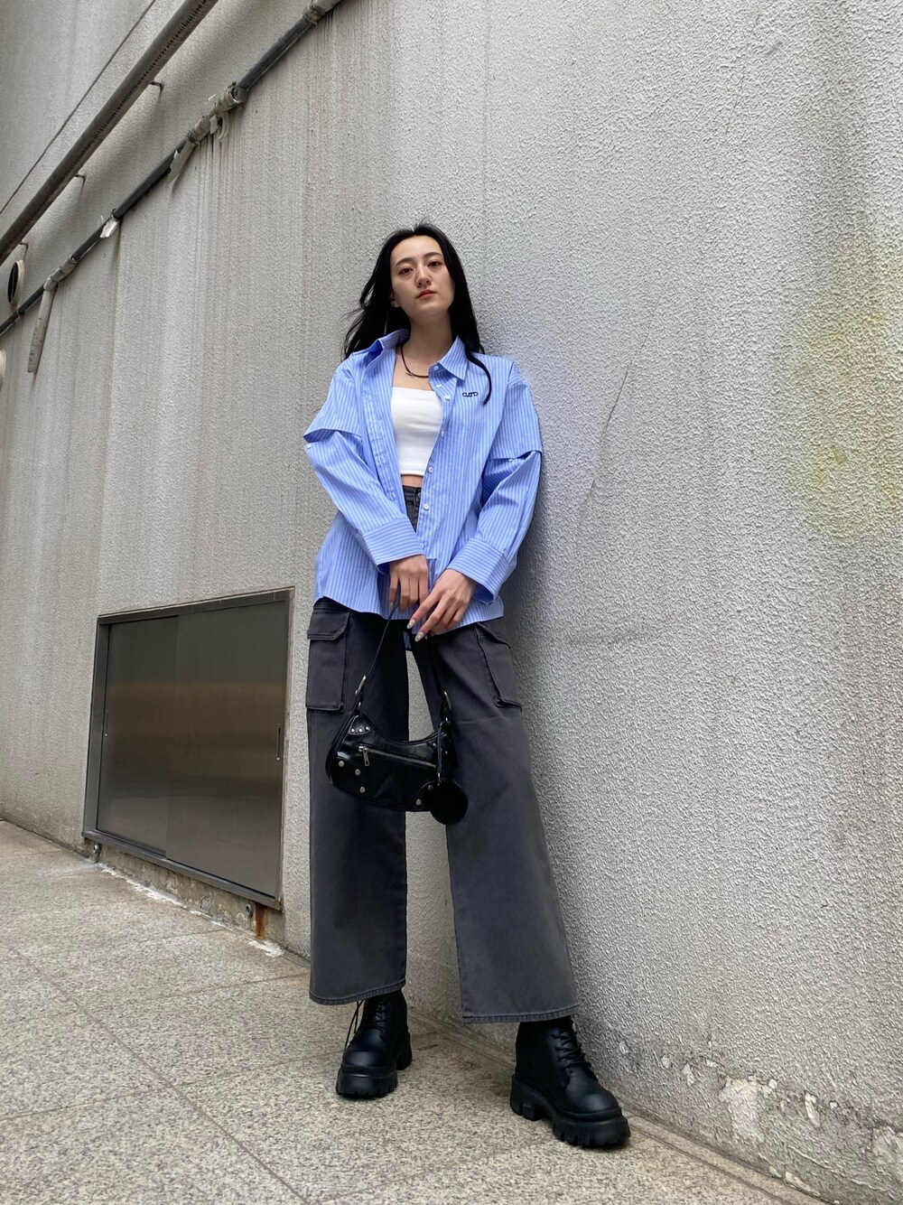 【春はシャツで大人カジュアルコーデ】【シャツ】袖がボタンで取り外し可能な2WAYタイプ!袖周りがゆったりしたシルエットなので、ボタンを開けて着るとウエストが細く見えます!【キャミソール】中にカップが縫い付けしてあるので、ズレず着やすいデザインです!シンプルな形なのでかなり使いやすいです!丈はおへそ少し上です!【デニム】Mサイズ着用でくるぶしかかるぐらいの丈感なので、高身長の方でもダボっとシルエットで履いていただけます!グレーのような色味がコーデをカジュアルにまとめてくれます!【ブーツ】Lサイズはインヒールが9cmあるので、厚底感なく足が盛れます!軽い素材なので疲れにくく1日中履いていただけます!26cmですが、紐を緩めるとぎりぎり履けるぐらいでした!【鞄】今季トレンドのハーフムーンデザインで、ミラー付きなのでかなり利便性が◎です!まちが広めなので折りたたみ財布もはいりました!