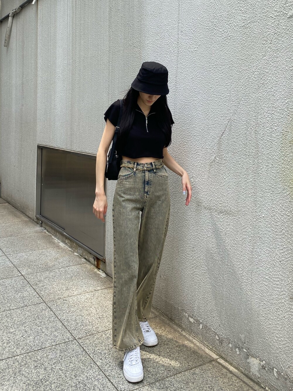 【夏のカジュアルコーデ】 【デニム】おへそ上のハイウエストのデザインなのでショート丈のトップスに合わせやすいです!骨盤部分からワイドに広がる形なので骨盤が張らずスッキリと見せてくれます!骨格ウェーブの方や骨盤広めの方にもおすすめです! 【トップス】毎年人気のハーフジップトップス!二の腕にかかるタンクトップなので腕がすっきりみえます!丈は胃辺りの短さです 【バケハ】深めに被れるバケットハットです!ノーマルなデザインなのでカジュアルに使いやすいです!