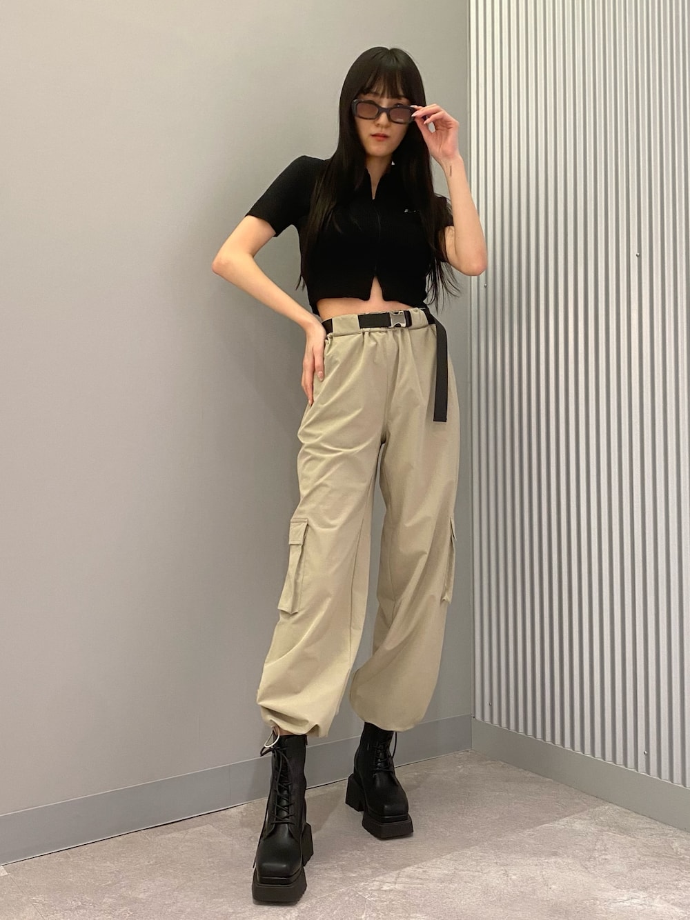 【初夏モードカジュアルコーデ】 【トップス】 今季トレンドのダブルジップデザインのトップスです!チャック全部下ろして丈感はおへそ上ぐらいでした!刺繍のロゴもさりげない感じなのがポイントです! 【ボトムス】 パンツはウエストゴムなのでとっても楽ちんです!フリーサイズですが高身長の方でも丈感しっかり長めで絞りもついてて調節も可能!万能アイテムです!ベルト付きなのでウエストマークして履くと脚長くみえるのでおすすめです! 【ブーツ】インソール9cmですが傾斜が緩やかなのでかなり安定感があって、スニーカー感覚で履いて頂けます!そして軽いので長時間履いても疲れにくいです!