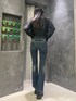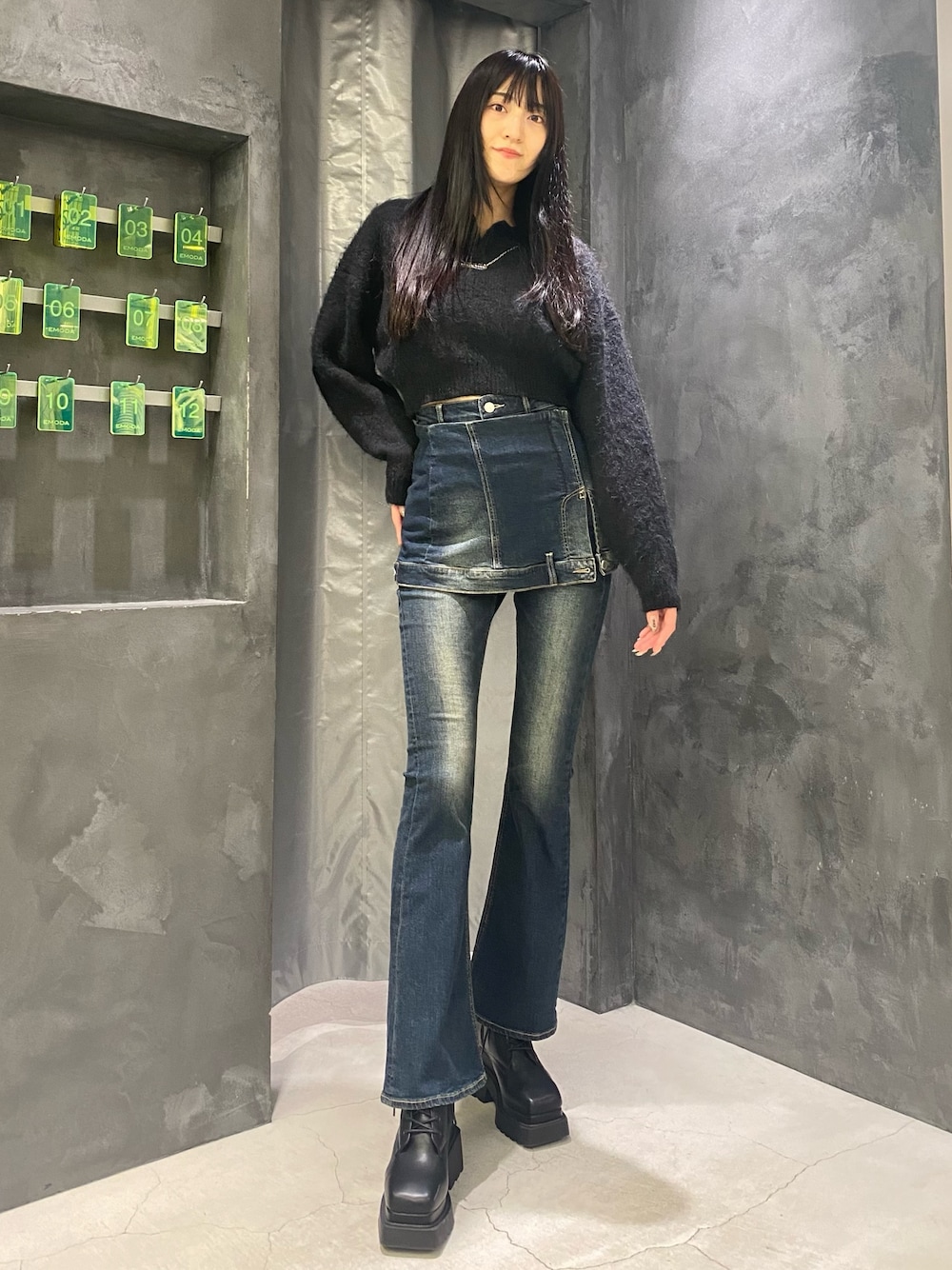 中村樹李亜(EMODA)のデニムパンツ「ウエストレイヤーハイウエストフレアパギンス」を使ったコーディネート