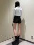 【シャツ】 レースアップがコーデのポイントになるアイテム!身長175cmで丈感はおへそ上くらいなのでカップ付きインナーキャミソールを合わせてレイヤードさせています!かっちりすぎないシャツの素材なのでシワにもなりにくく、ラフに着用頂けます! 【ショートパンツ】 ハイウエストのデザインでトップスが合わせやすいデニムショートパンツ!前からみたらスカート風になっているのでカジュアルすぎず、かわいい風にも着回しできる万能なデニムパンツです!こちらはセットアップとしても着用可能です! 【ショートブーツ】 真夏以外のシーズンで使いやすいショートブーツです!ヒールの高さは8cmですが傾斜が緩やかで見た目的にも厚底感がなく履いて頂けるところが推しポイントです!普段厚底履いたことない方でも挑戦しやすいのでおすすめです!普段靴のサイズは26cmで、ギリギリ履けるぐらいでした!サイドゴアのデザインなので着脱も楽ちんでした!