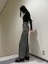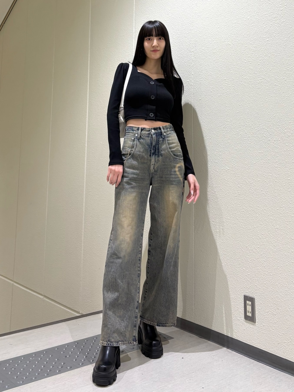 【トップス】 首元は開きすぎないスクエアVネックのデザインなので自然にデコルテを綺麗にみせてくれます!ボタンはフェイクになっています!袖は少し長めで手の甲までかかるぐらいの丈感です!身長175cmでおへそ上くらいの丈感なのでおへそ隠れるハイウエストのボトムスとの相性◯でした! 【バッグ】 チェーンは取り外し可能で、スタッズのような英字デザインがシンプルなのにコーデを一気に映させてくれます!まちも広めで前にはポケット付きなので収納力もあります!実際中身を入れてみると小さい折り畳み財布、キーケース、携帯、ワイヤレスイヤホン、ポーチ(リップ類)が入るぐらいでした! 【デニム】 サイドに入ったハートのデザインがポイントのルーズデニム!ワイドすぎない細めのワイド型なのでラインを拾いすぎず足を長くみせてくれます!おへそ上のハイウエストのデザインなのでショート丈のトップスと合わせやすいです!身長175cm、Sサイズ着用でくるぶしギリギリかかるぐらいでした! 【ショートブーツ】 真夏以外のシーズンで使いやすいショートブーツです!ヒールの高さは8cmですが傾斜が緩やかで見た目的にも厚底感がなく履いて頂けるところが推しポイントです!普段厚底履いたことない方でも挑戦しやすいのでおすすめです!普段靴のサイズは26cmで、ギリギリ履けるぐらいでした!サイドゴアのデザインなので着脱も楽ちんでした!