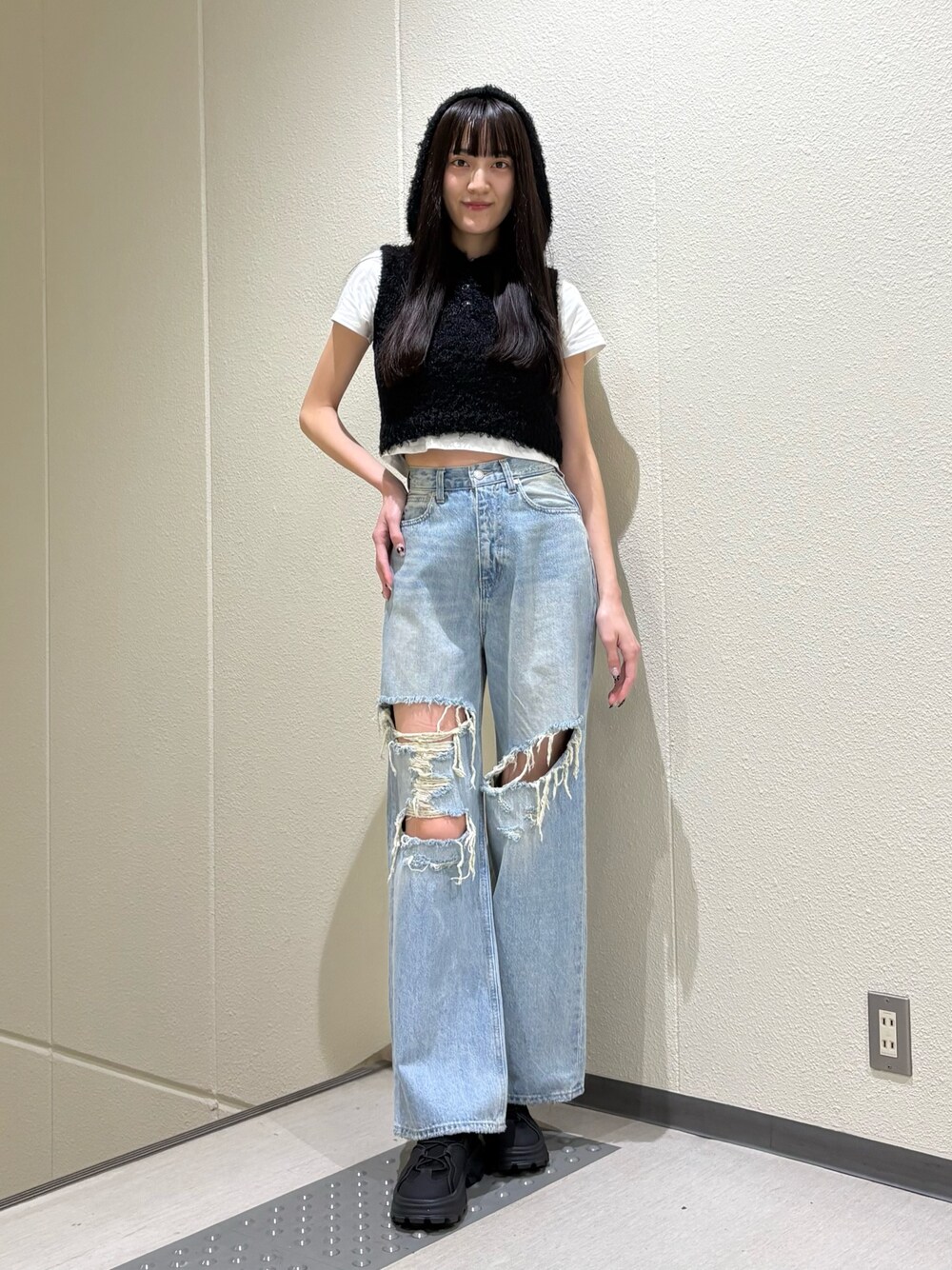 【Tシャツ】 インナーとして着用しているこのTシャツはフリーサイズで身長175cmの私でおへそ少しだけ上の丈感です!ピタッとしたシルエットで袖が長すぎない丈感なので二の腕がスッキリ見えます! 【ニットフードタンクトップ】 シャギー素材のフード付きタンクトップなので、そのまま着ても中に長袖や半袖のインナーを着よさせても秋口まで着まわせる万能なデザイントップスです!EMODAにしかないデザインなので人と被りにくいのでおすすめです! 【シューズ】 スニーカー風の軽くて履きやすいデザインなのにヒールが7.2cmあるのでヒール感なくさりげなく足が盛れるシューズ!靴紐ではなくマジックテープで着脱できるため履き心地も抜群でした!足のサイズ26cm、 Lサイズ着用でギリギリ履けるぐらいでした! 【デニム】 クラッシュのデザインが目を引く細めのワイドデニム!おへそ上ぐらいのハイウエストなのでショート丈のトップスと相性が◯です! 後ろのポケットが高めの位置にあるのでヒップアップ効果があります!身長175cm、Mサイズ着用でくるぶしギリギリかかるぐらいでした!