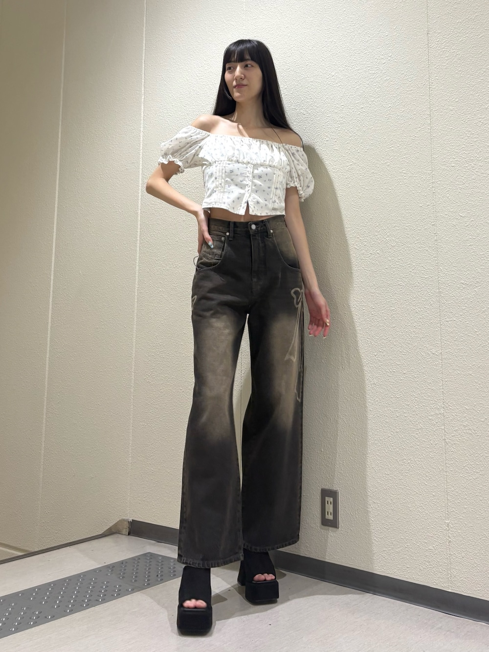 中村樹李亜(EMODA)のデニムパンツ「リボングラフィックルーズジーンズ」を使ったコーディネート