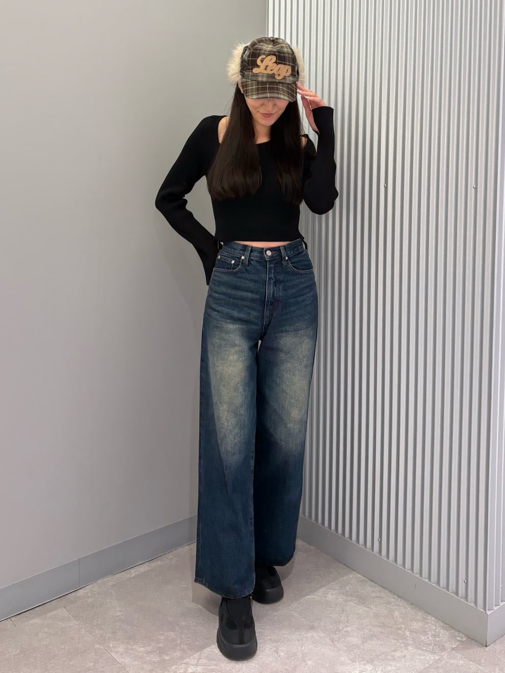 中村樹李亜(EMODA)のデニムパンツ「アートステッチワイドルーズジーンズ」を使ったコーディネート
