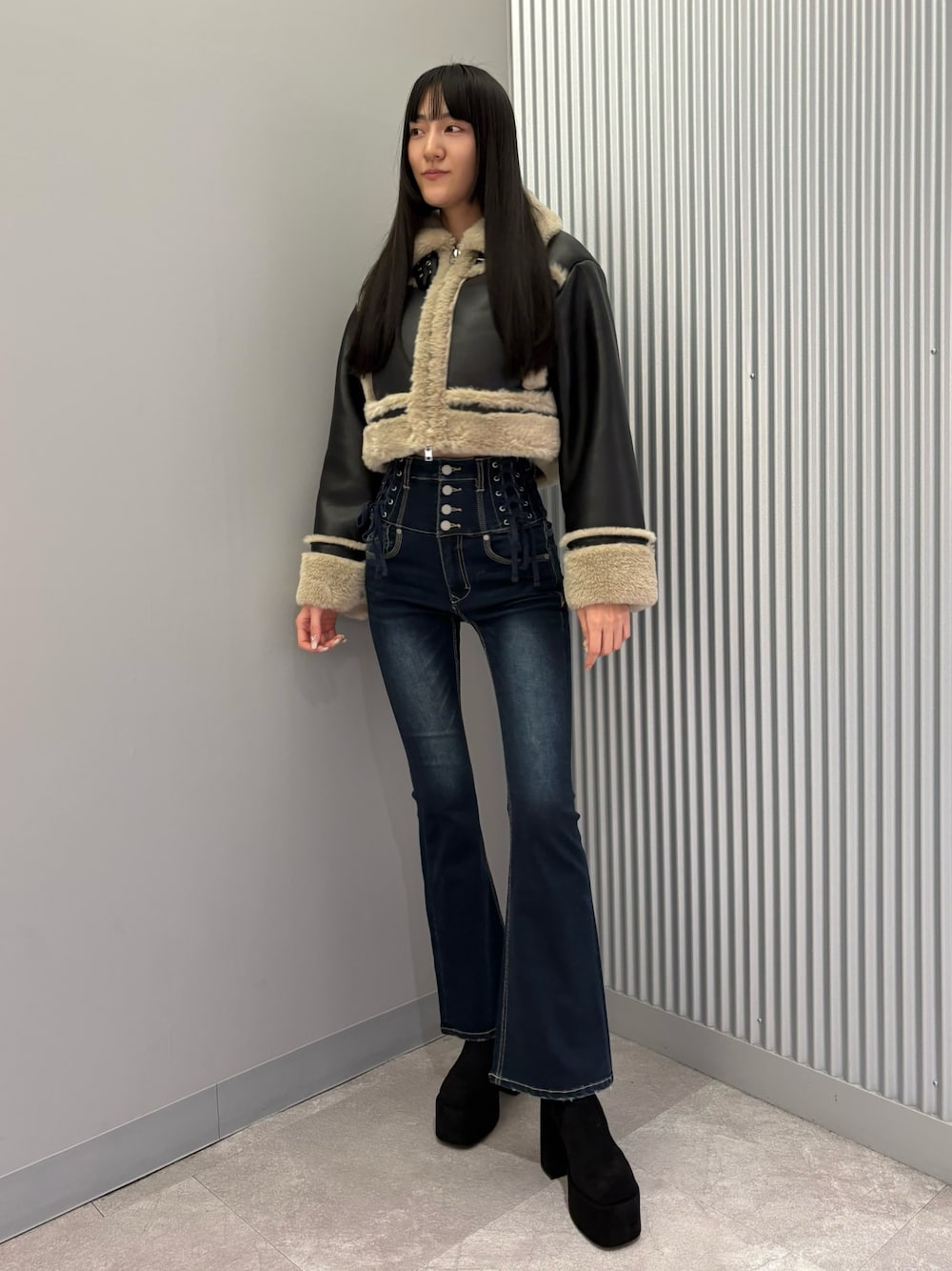 中村樹李亜(EMODA)のデニムパンツ「スリーレースアップハイウエストフレアパギンス」を使ったコーディネート