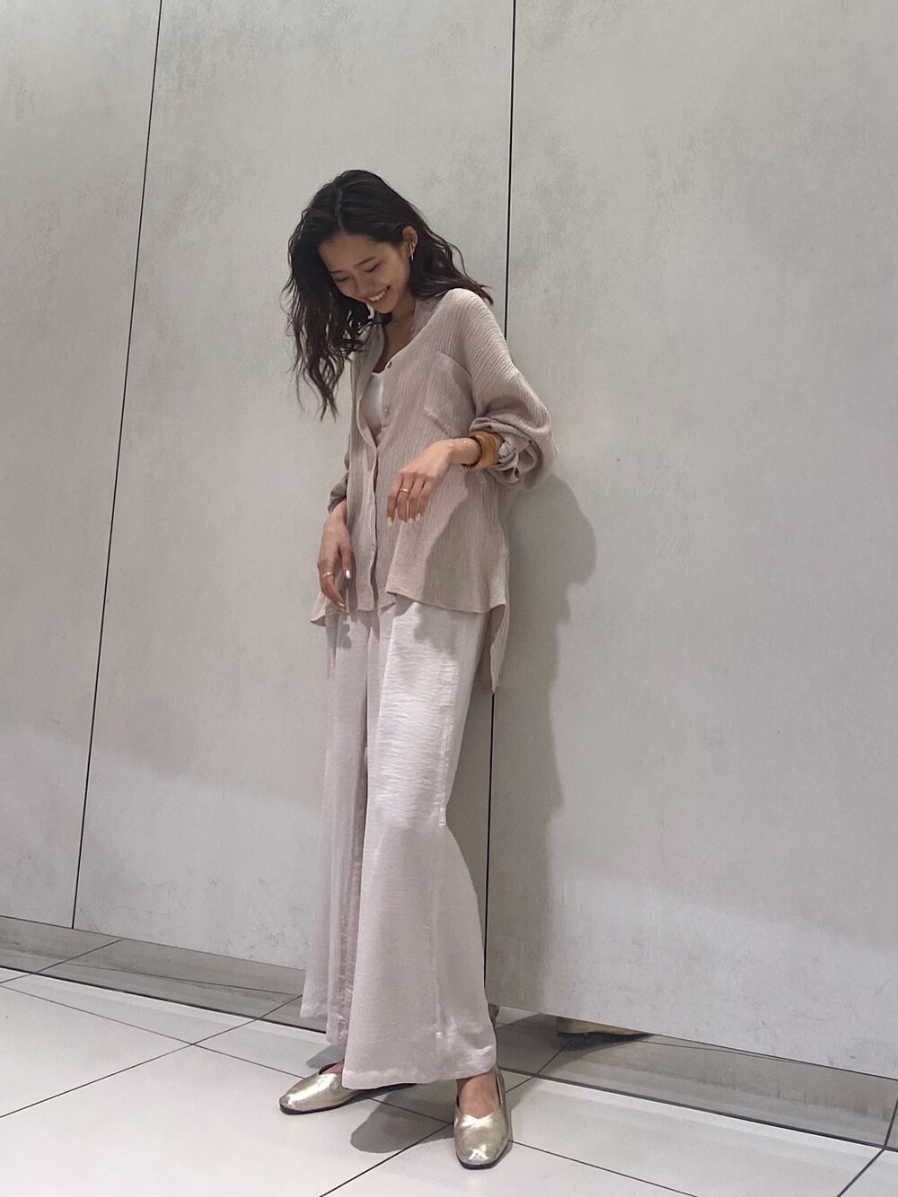 楊柳素材のビックルーズシャツとサテンパンツのワントーンコーデ!!色味をワントーンにすることで、カジュアルなゆったりとしたシルエットを大人カジュアルに!羽織としても使えるシャツは長さがゆったりしているため、色々な形に合わせていただきやすいです○サテンのパンツは後ろのウエスト部分がゴムになっているので、履き心地が良く、タックデザインが入っているためおしゃれ見えをしてくれるアイテムです!インナーには、キャミデザインのボーディースーツを選び、鎖骨のラインを出すことにより女性らしさを出しました!!