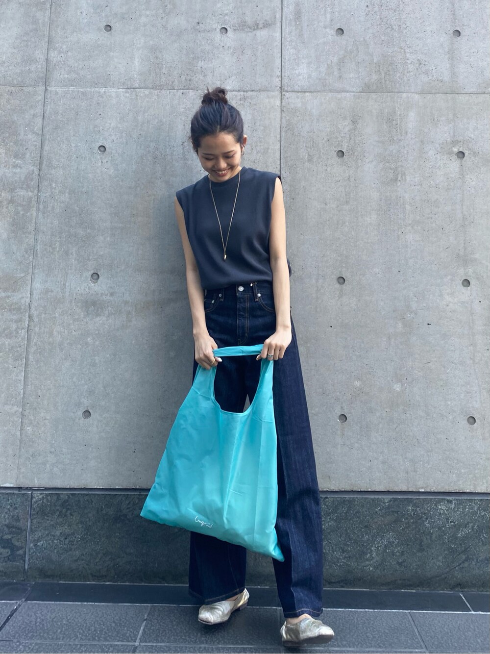 シンプルオシャレ見え⭐︎近くにお買い物に行くコーディネートをしてみました!!暖かくなってきて、肌を見せる時期にあえて暗めのワントーンを、コーディネートに映えるカラーのエコバックを持って♪ワッフル素材のトップスは生地感が柔らかく、透け感も気にならないので一枚で着ていただきやすいです! 上がスッキリした印象なので、ボトムスはゆったりしたストレートデニムに!ワンウォッシュでセンタープレスが入っているので、大人カジュアルコーデにオススメです!エコバックは、サイズ感も程よく、畳んでカバンに入れることもできるので持ち運びも便利です○