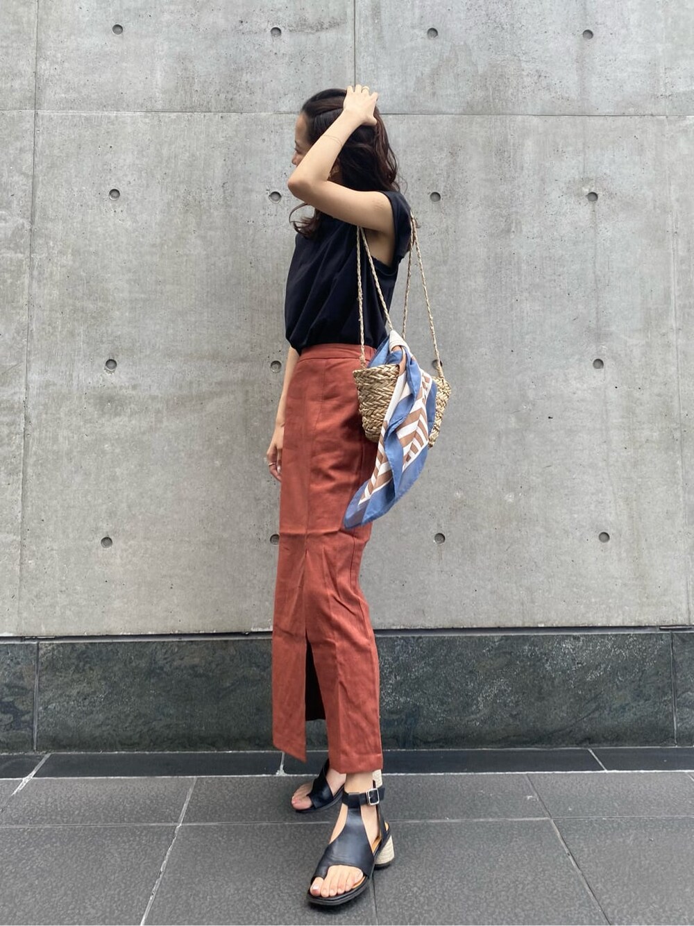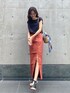 ボトムスにカラーを取り入れた、大人カジュアルコーディネート⭐︎【tops】バックオープンでデザイン性のあるトップスは、肌見せにより程よくカジュアルな印象にしてくれます!肩幅が広めに作られているので、肩が気になられる方にもオススメです♪【bottom】今回のコーディネートのメインアイテムは、オレンジのスカートです♡程よいスリットが、可愛く、普段あまりカラーを着られない方でも少し暗めのトーンなので挑戦しやすいです!シルエットも下にまっすぐ降りてくれるので、スッキリした印象を与えてくれます♪【shoes】安定感があり、コーディネートを引き締めてくれるサンダルです!高身長の方で足首が出ることによりバランスが取りにくい時に使いやすいです!【bag】持ち手が細く華奢なので、綺麗めコーディネートにも合わせていただきやすく、これからの時期にカゴバックを持つだけで一気に夏らしさが⭐︎スカーフをプラスすることで、明るくお洒落な印象に!!