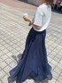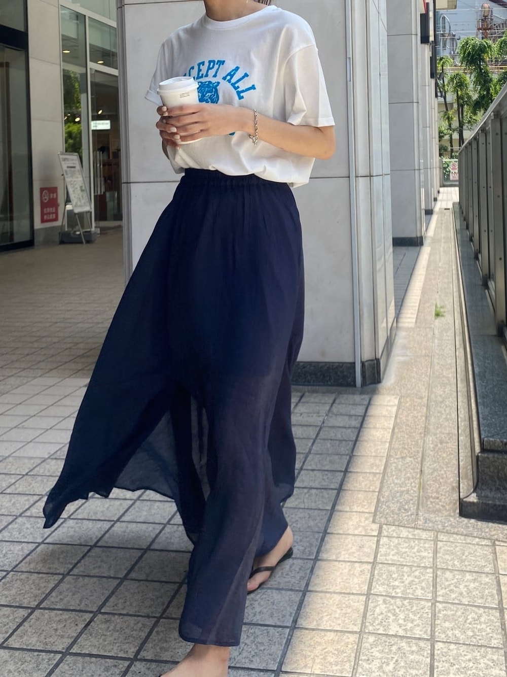 ボリュームのあるスカートとTeeを合わせた大人カジュアルコーディネート♪【Tops】立体感のあるプリントが施されたTeeは、程よいサイズ感になっておりアウトでもインでも着ていただけます!配色が可愛く、ブルーデニムとの合わせもおすすめです⭐︎【skirt】シアーのスカートはたっぷりとしたボリューム感が可愛く、スリットが入っているため動いた時に抜け感が出てくれるデザインです!ペチコートがついており、膝上までの長さなのでヒップ周りの透け感を気にせず履いていただけます♪