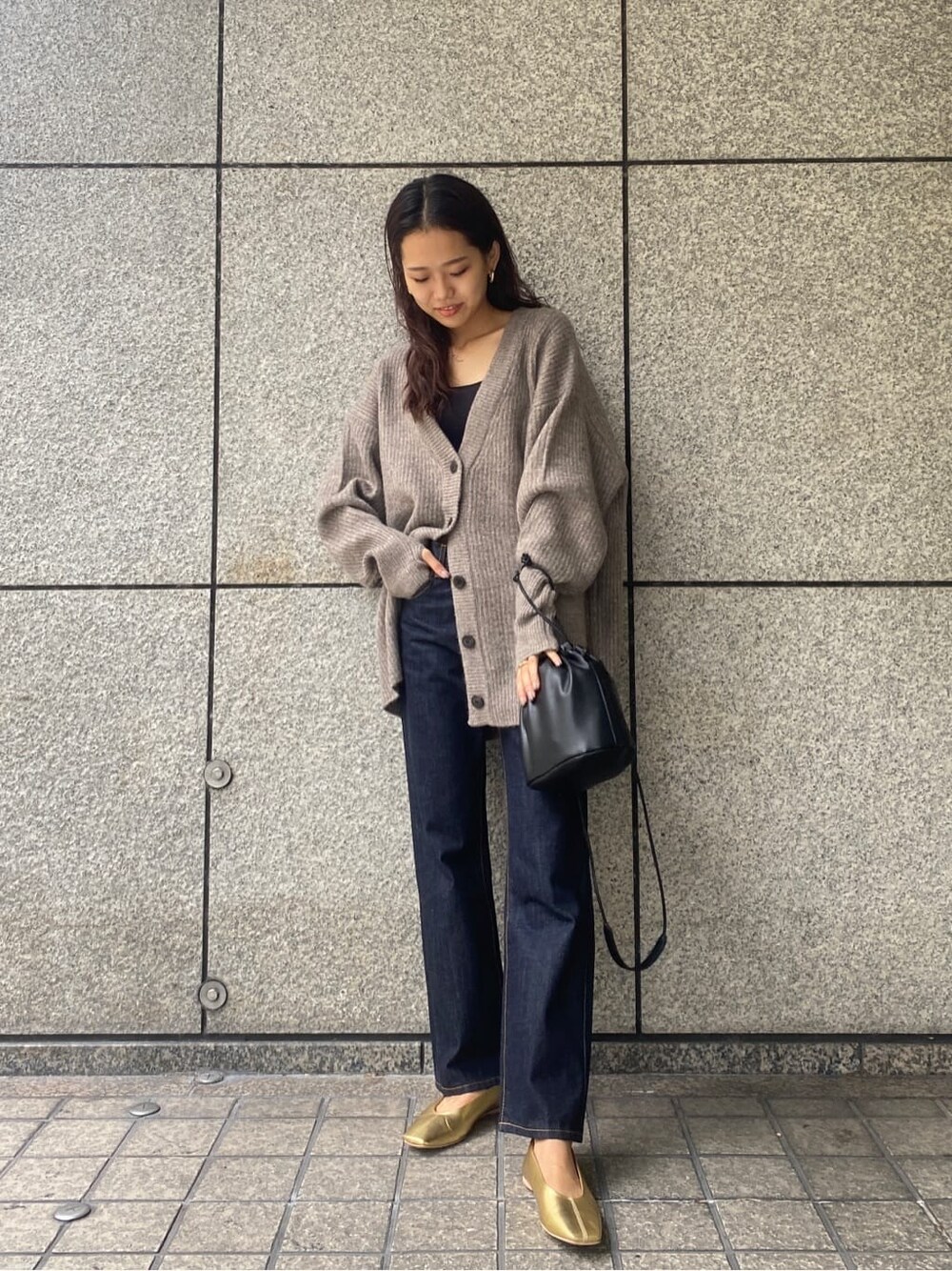 ゆったりサイズのカーディガンにスッキリ見えするストレートデニムを合わせた、シンプルカジュアルコーデ♪【Tops】ヒップがしっかり隠れる丈間のカーディガンは、サイズも少しゆったりめでインナーを選ばず着ていただけます少し肌寒い時の羽織に万能アイテムです!!色味も落ち着いたトーンになっていて、カジュアルにも女性らしいコーディネートにも使っていただきやすいです!!【Denim】ストレートデニムは細すぎず太すぎず、気になるところをカバーしてくれるデニムです!きれいめなデニムはステッチデザインが可愛く、色々なトップスと合わせていただきやすいです○ 【Bag】使い回しのできる、巾着バッグは肩掛けもしていただけます◎コンパクトですが、小さいお財布や小物はしっかり入るサイズ感です!【shoes】細身のフラットシューズは、カジュアルなアイテムと合わせてもレディな印象に!クッション性があるのでフラットの独特の疲れもなく長時間履いていただけますよ!